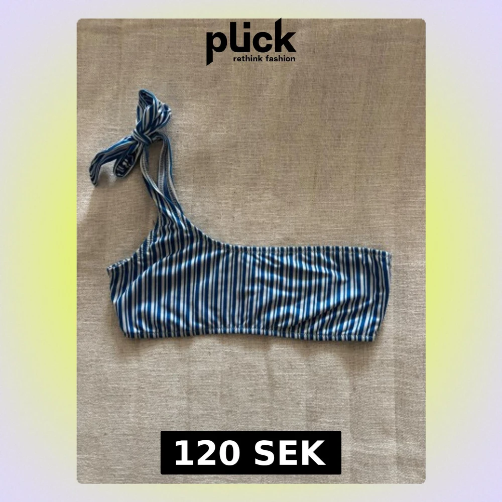 Nyskick!! Bikiniöverdel med blå och vita ränder från Benetton. Modellen är asymmetrisk med en axel och knytband.