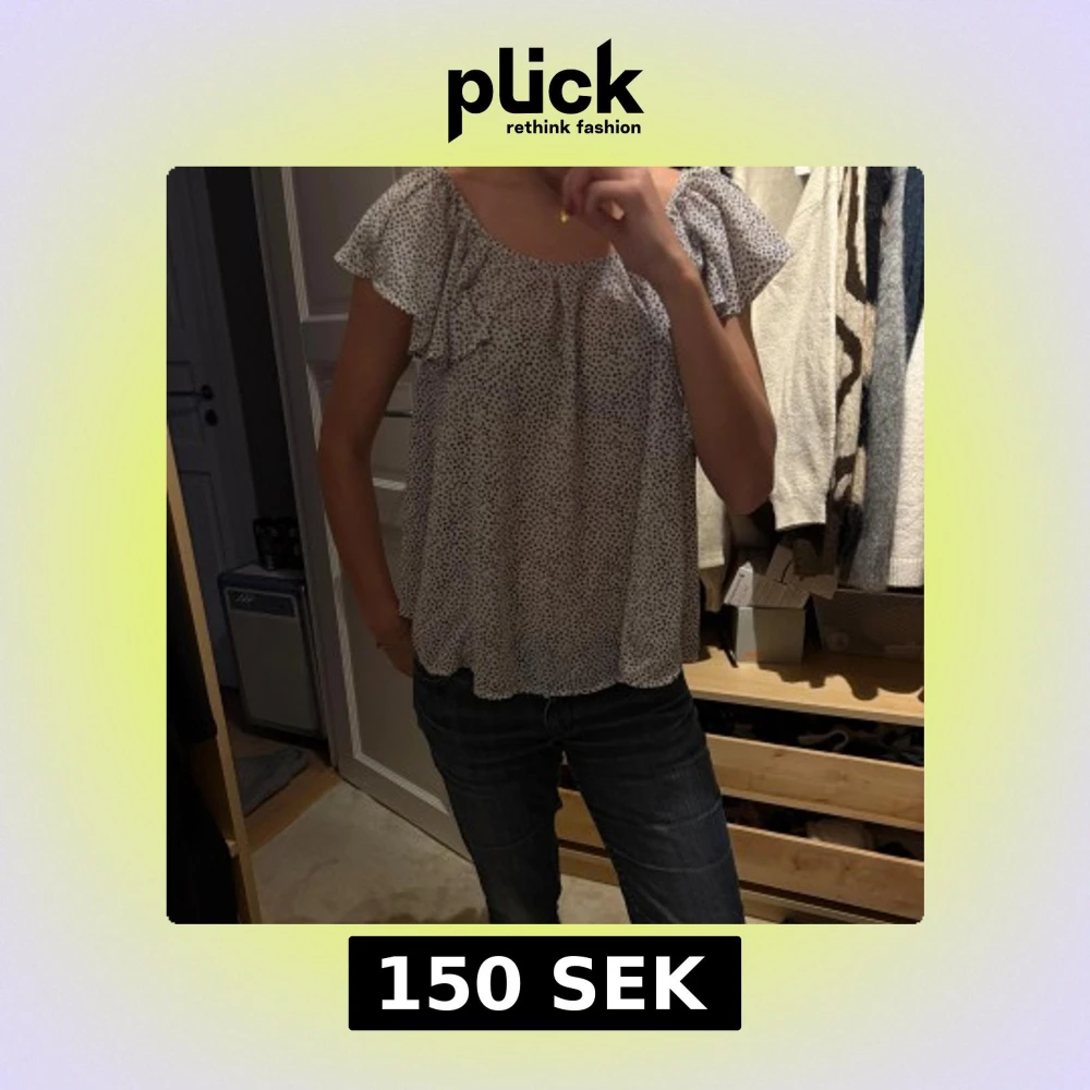 Söt och luftig blus i vitt med små svarta prickar. Blusen har korta volangärmar och en lös passform med rundad halsringning. Perfekt för varma dagar och enkel att styla med jeans eller kjol.