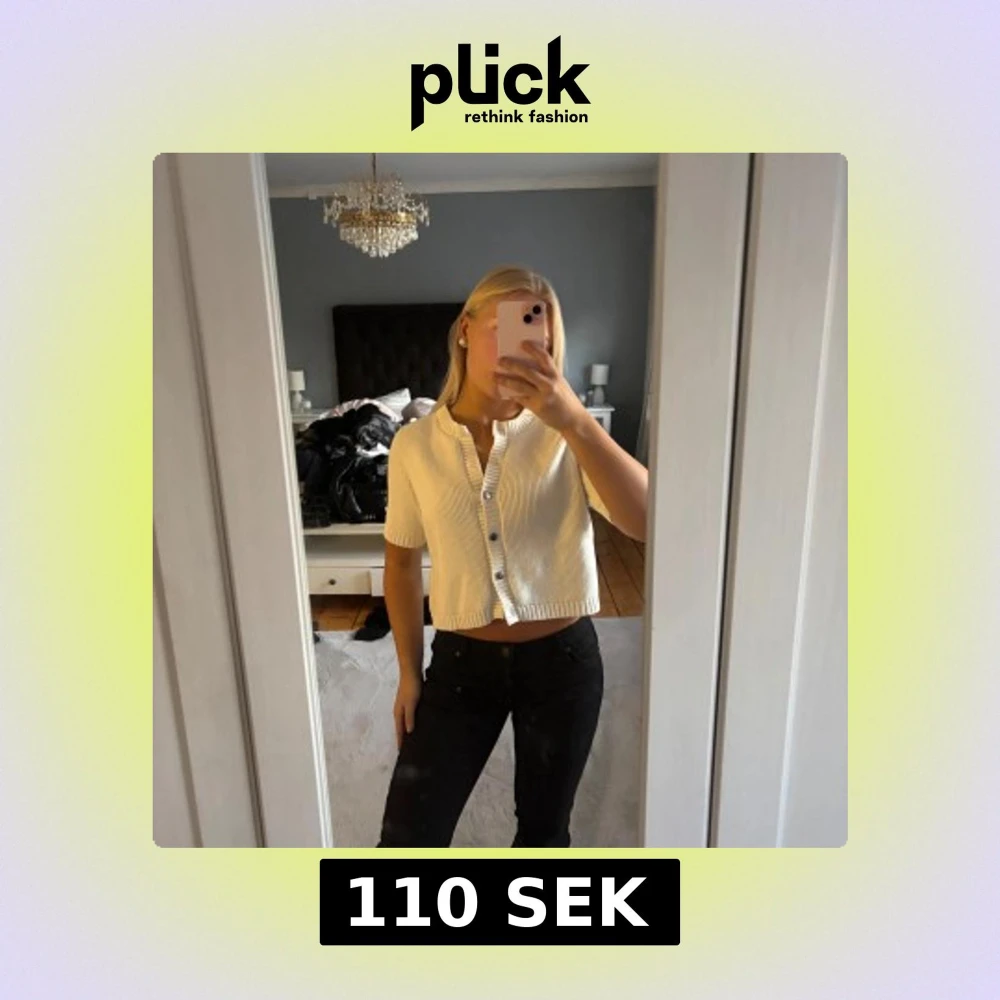 Supersöt kortärmad kofta! Knappt använd men tyvärr har 3 av knapparna lossnat i tvätten (se bild). Det funkar att använda den både öppen och stängd ändå men har 1 reserknapp om man skulle vilja sy på. Säljer då den inte kommer till användning💕🤍