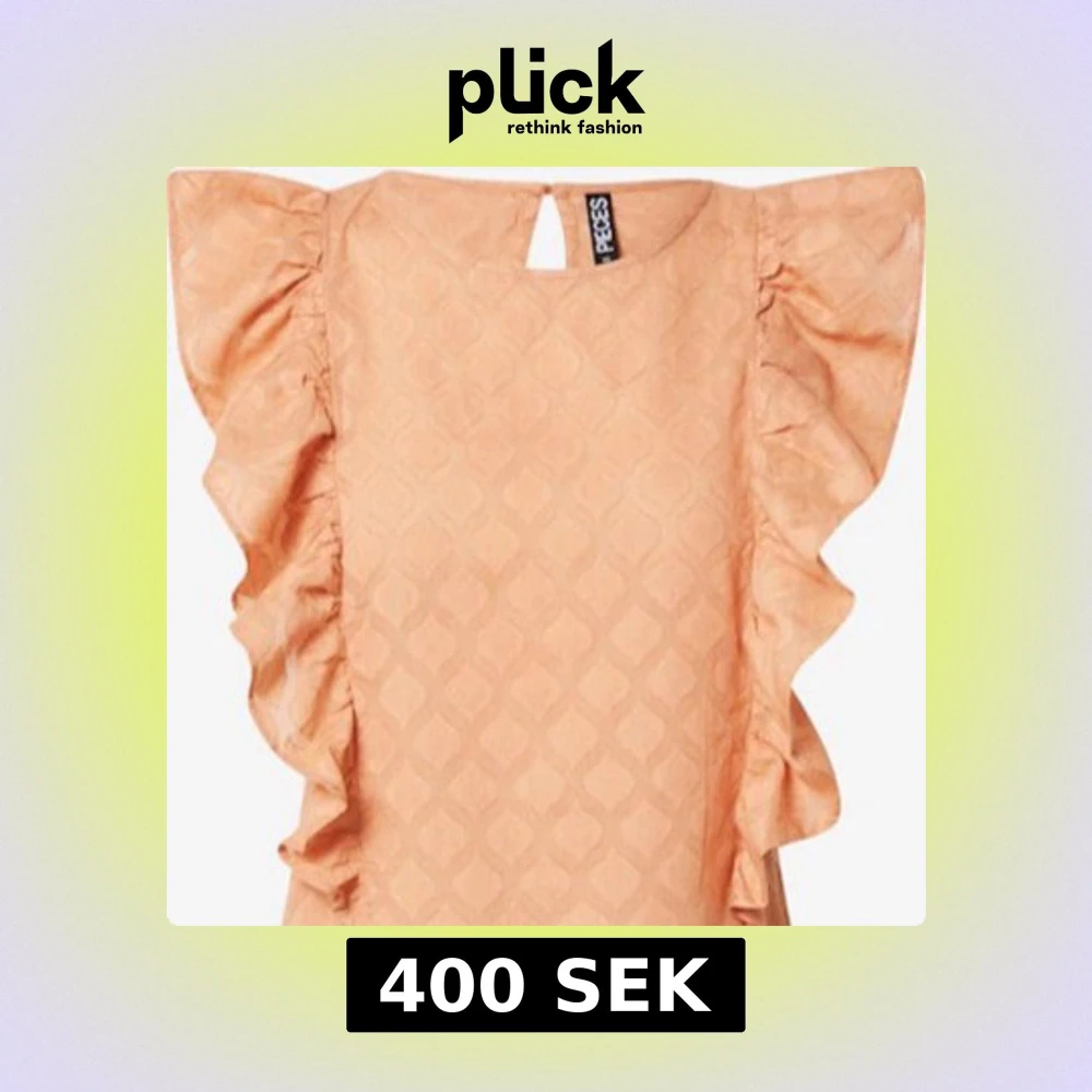 Säljer en söt persikofärgad blus med volangdetaljer längs sidorna. Blusen har en rund hals och ett diskret mönster som ger en elegant touch. Perfekt för en stilfull look. Kontakta för egna bilder