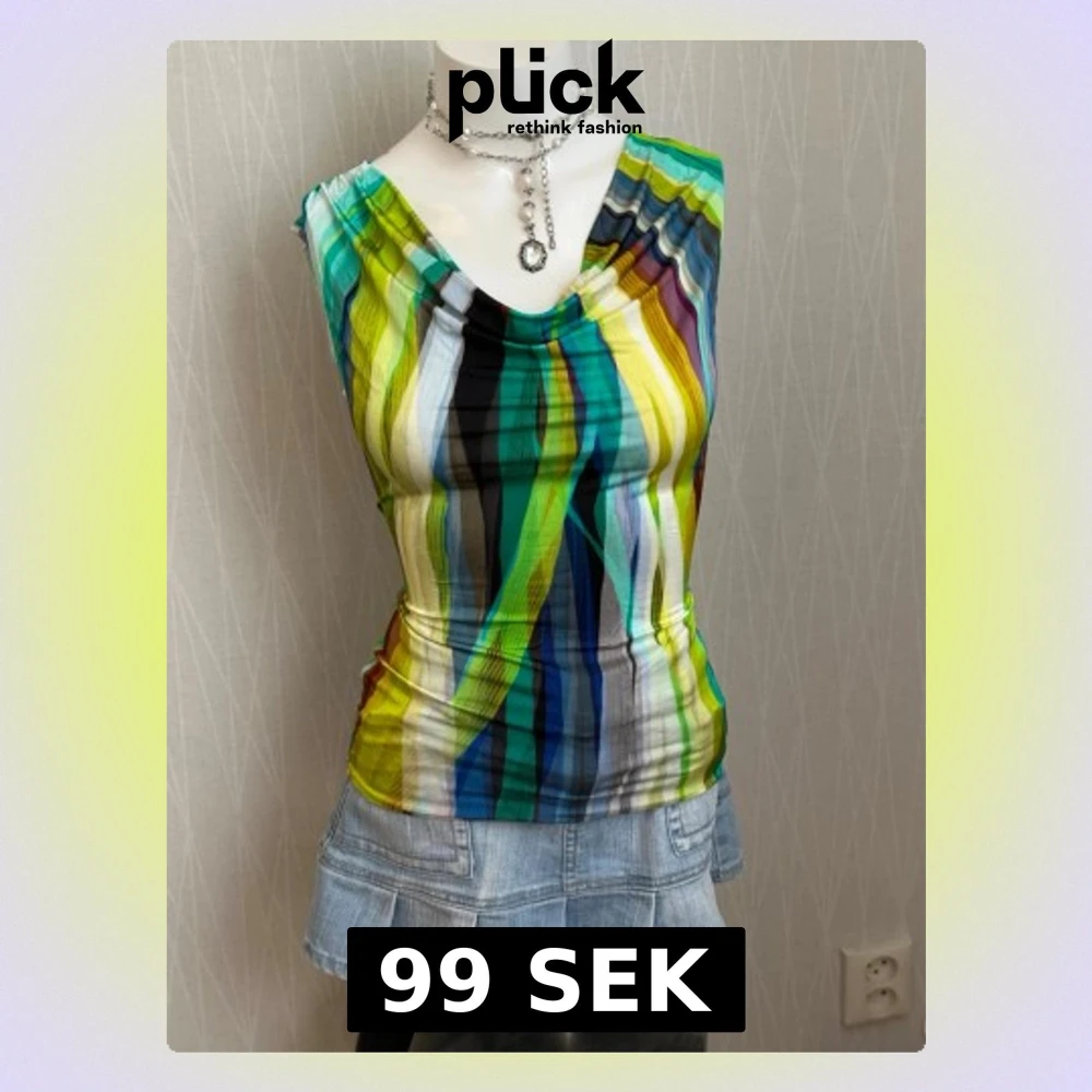 Säljer en färgglad ärmlös topp med randigt mönster i grönt, blått, gult, svart och vitt. Toppen har en snygg draperad v-ringning och är figurnära i modellen. Perfekt för dig som vill sticka ut med en unik och trendig stil.