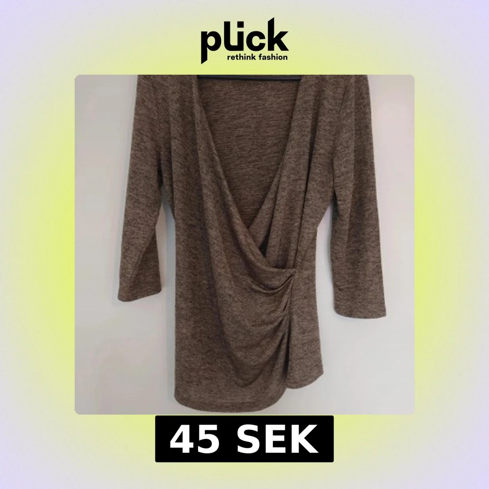Snygg guldbrun topp i mjukt stretchigt material med omlott och draperad front. Tröjan har trekvartsärm och djup v-ringning, perfekt för dig som gillar en stilren men ändå cool look.