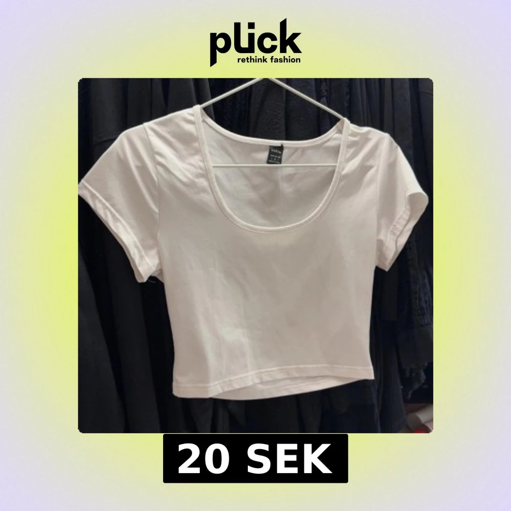 Säljer en enkel och stilren vit croppad t-shirt. T-shirten har korta ärmar och en rund, djup urringning. Perfekt att matcha med jeans eller kjol för en avslappnad look.