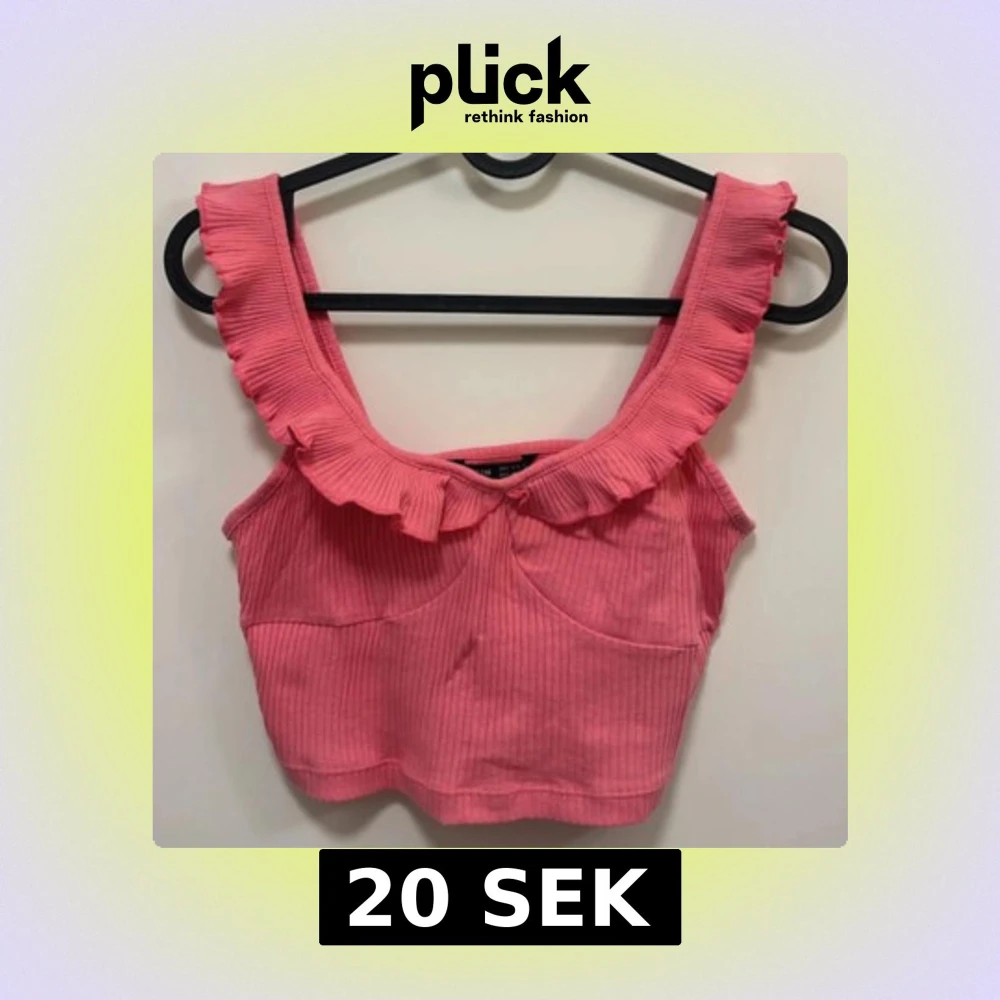 Supersöt rosa croppad linnetopp med breda axelband och volangdetalj längs ringningen. Toppen är ribbad och har en tight passform, perfekt för varma dagar.