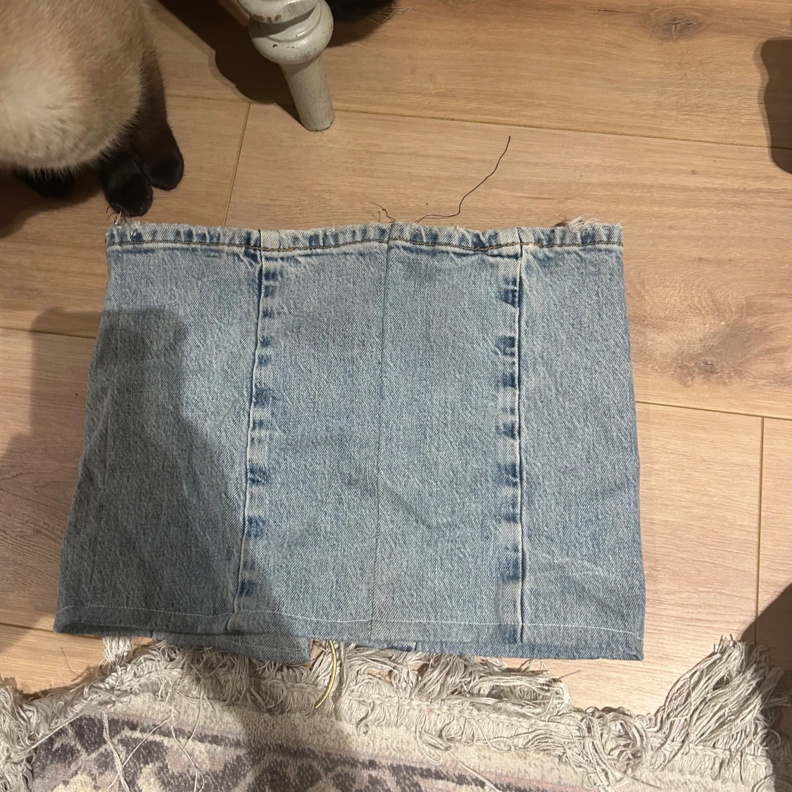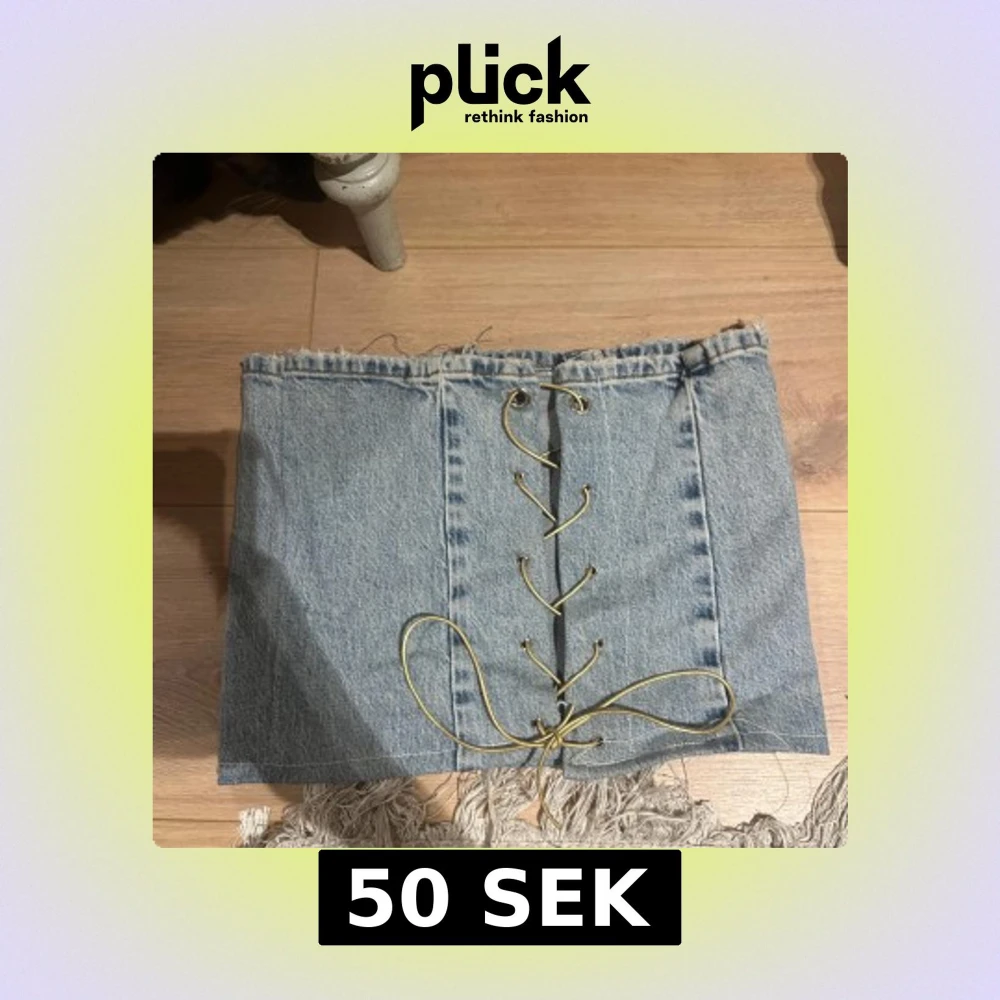 Säljer en snygg tubtopp i ljusblå denim med snörningsdetalj framtill. Toppen är axelbandslös och har en cool, croppad passform. Perfekt att styla till både kjol och byxor för en trendig look.