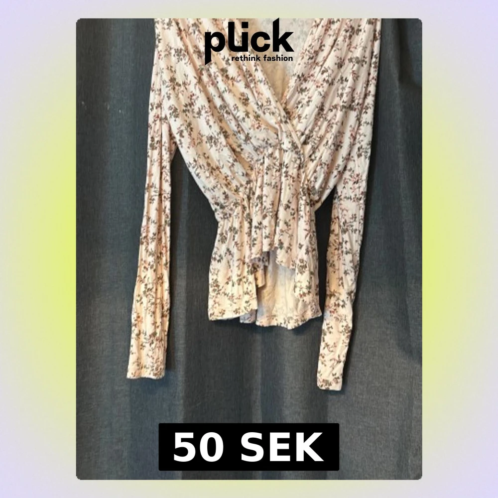 Supersöt omlottopp i ljusbeige med småblommigt mönster i rosa och grönt. Toppen har långa ärmar, volangkant nertill och knyt i midjan för en snygg passform. Perfekt för dig som gillar romantisk och feminin stil.