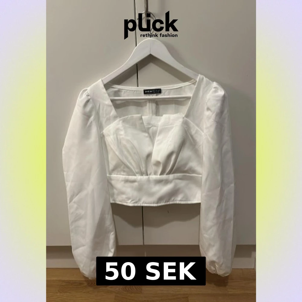 Säljer en vit croppad blus från SHEIN i storlek S. Blusen har långa puffärmar, fyrkantig urringning och snygga veckade detaljer framtill. Materialet är glansigt och känns lyxigt, perfekt för att sticka ut. Dragkedja i ryggen för enkel påklädning.