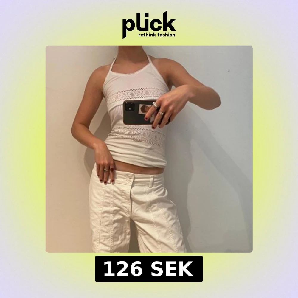 Säljer en vit halterneck linnetopp med fina spetsdetaljer och broderade partier. Toppen är croppad och har smala band som knyts i nacken. Perfekt för varma dagar och ger en fräsch och somrig vibe.