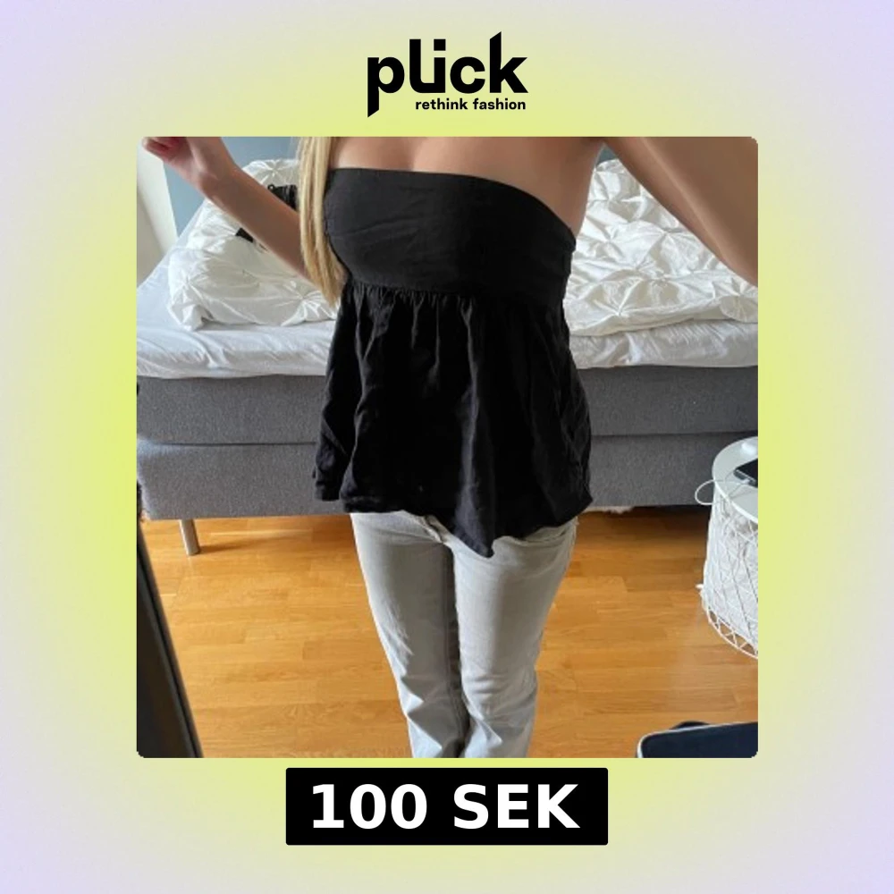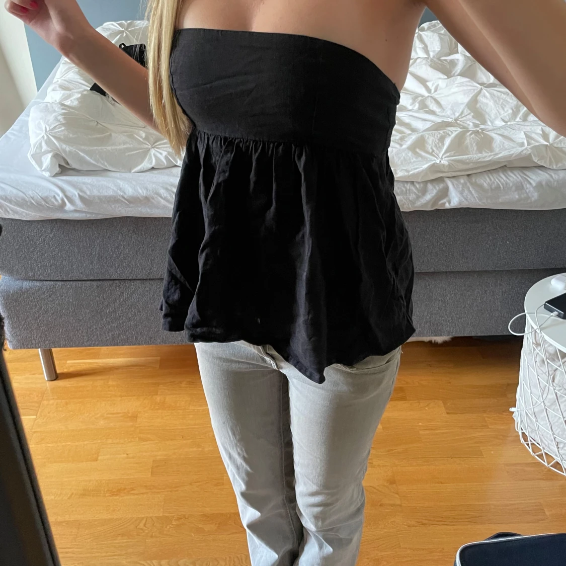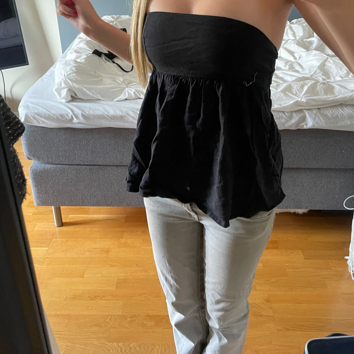Säljer en svart bandeau tubtopp med volym och lätt rynkad nederdel. Toppen är axelbandslös och har en luftig, flowy passform som ger en cool och avslappnad vibe. Perfekt att styla med jeans eller kjol för en trendig look.