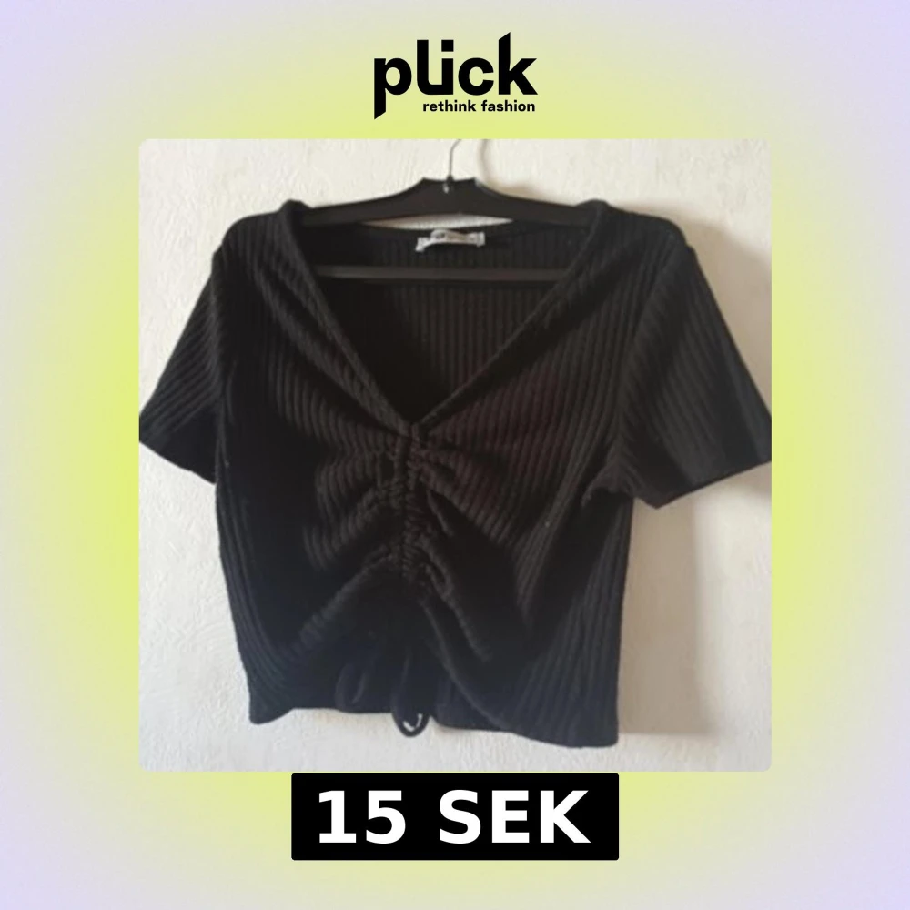 Säljer en svart ribbad topp från FB Sister med korta ärmar och en snygg knytdetalj framtill. Toppen har en v-ringad design och är perfekt för en stilren look.