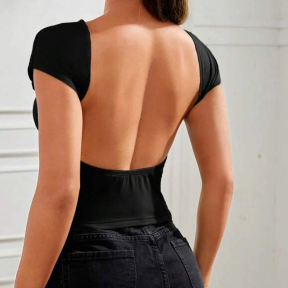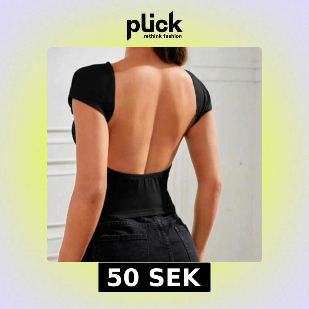 Trendig svart croppad topp med korta ärmar och helt öppen rygg. Toppens material är stretchigt och följsamt.