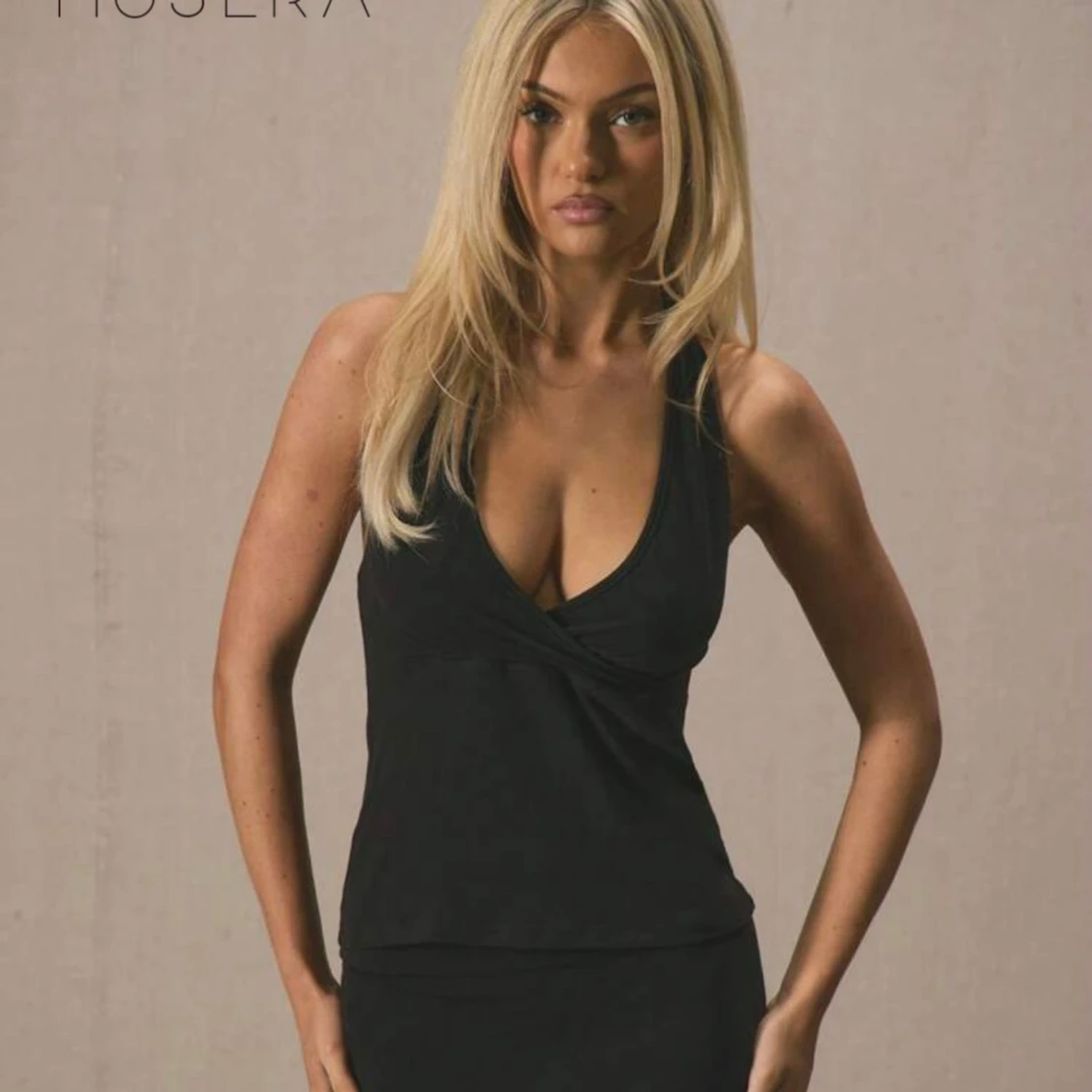 Supersnyggt svart linne från Hosera med halterneck och djup v-ringning. Omlottdetalj framtill och knyt i nacken ger en stilren och trendig look. Perfekt till jeans eller kjol när du vill sticka ut lite extra.