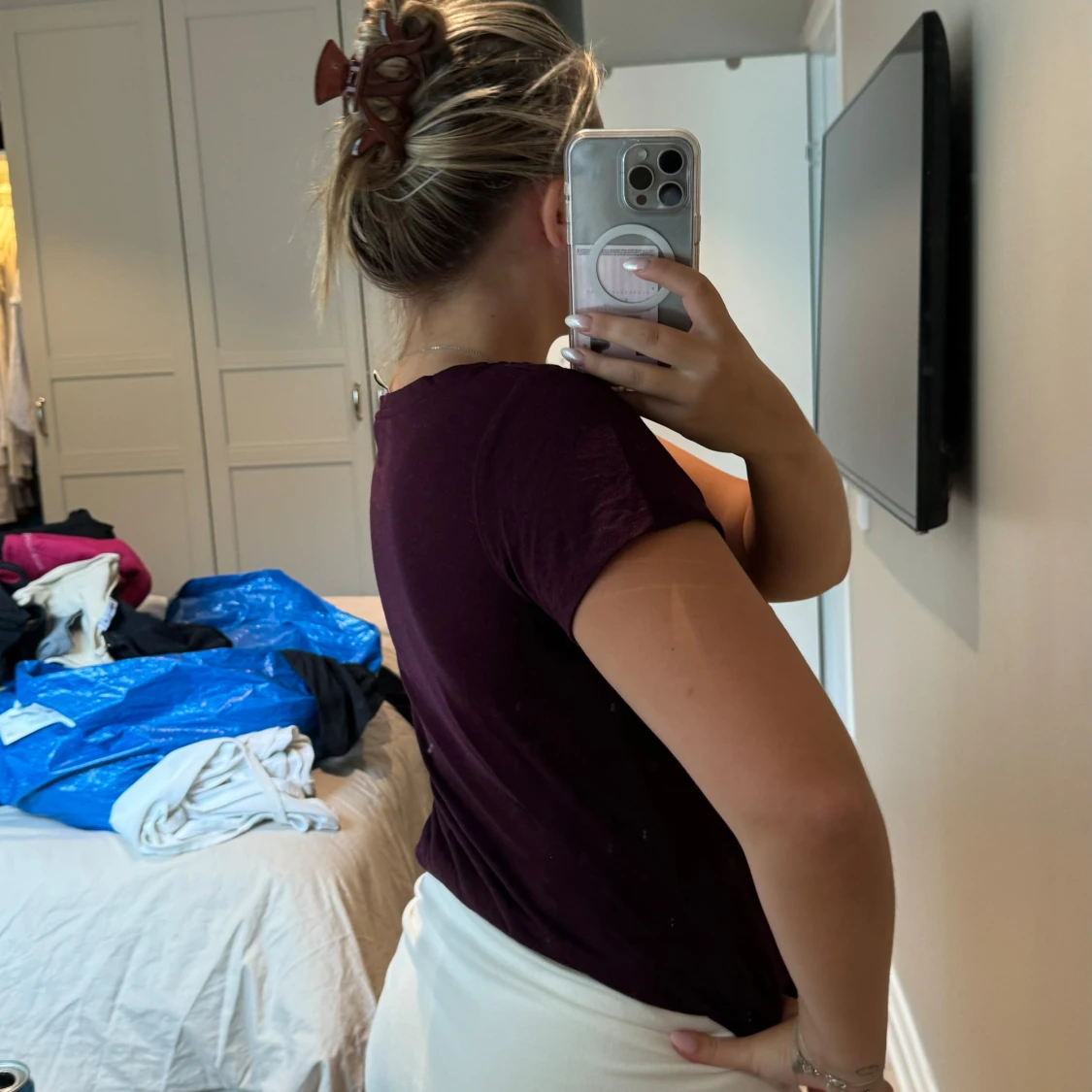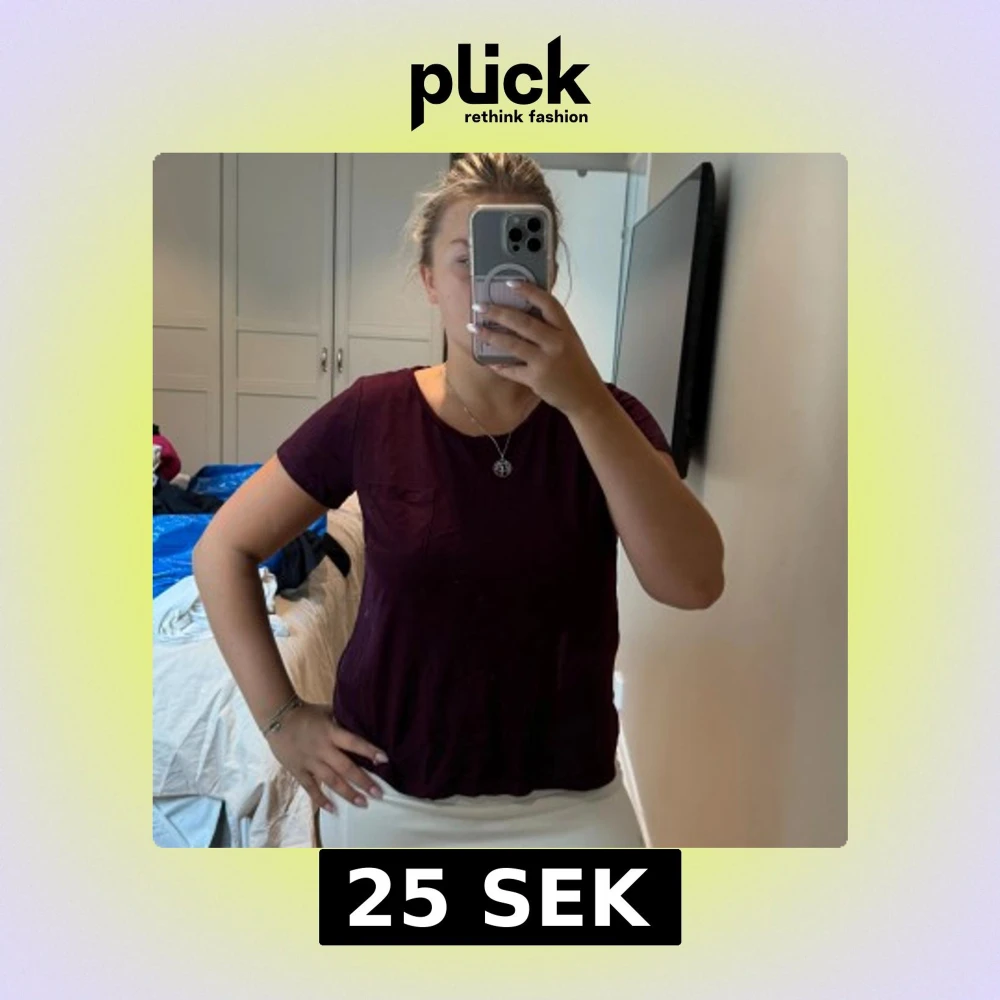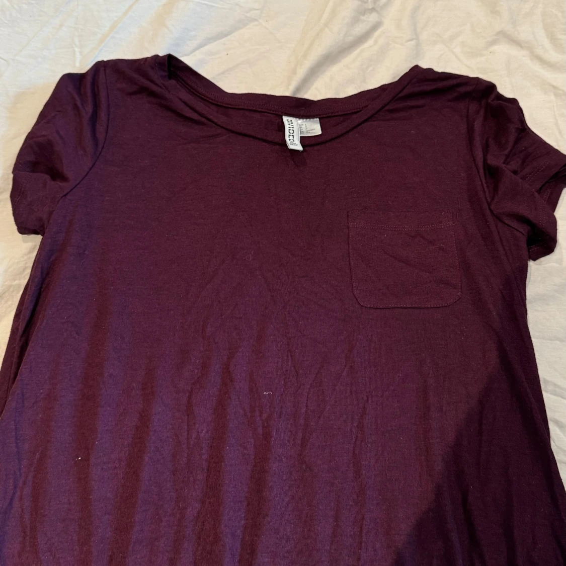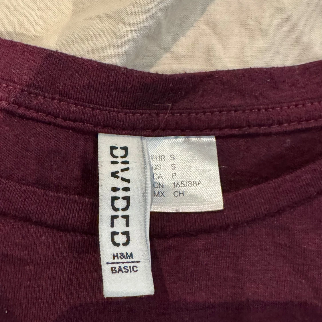 En enkel och snygg mörklila t-shirt från H&M Divided, modell Basic. Toppen har rund hals, korta ärmar och en liten bröstficka på vänster sida. Perfekt att matcha med jeans eller kjol för en chill look.