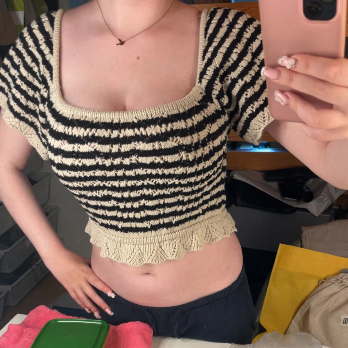 Superfin croppad stickad topp med svart och beigea ränder. Toppen har korta ärmar, fyrkantig urringning och en söt volangkant nertill. Perfekt för dig som gillar en trendig och unik look!