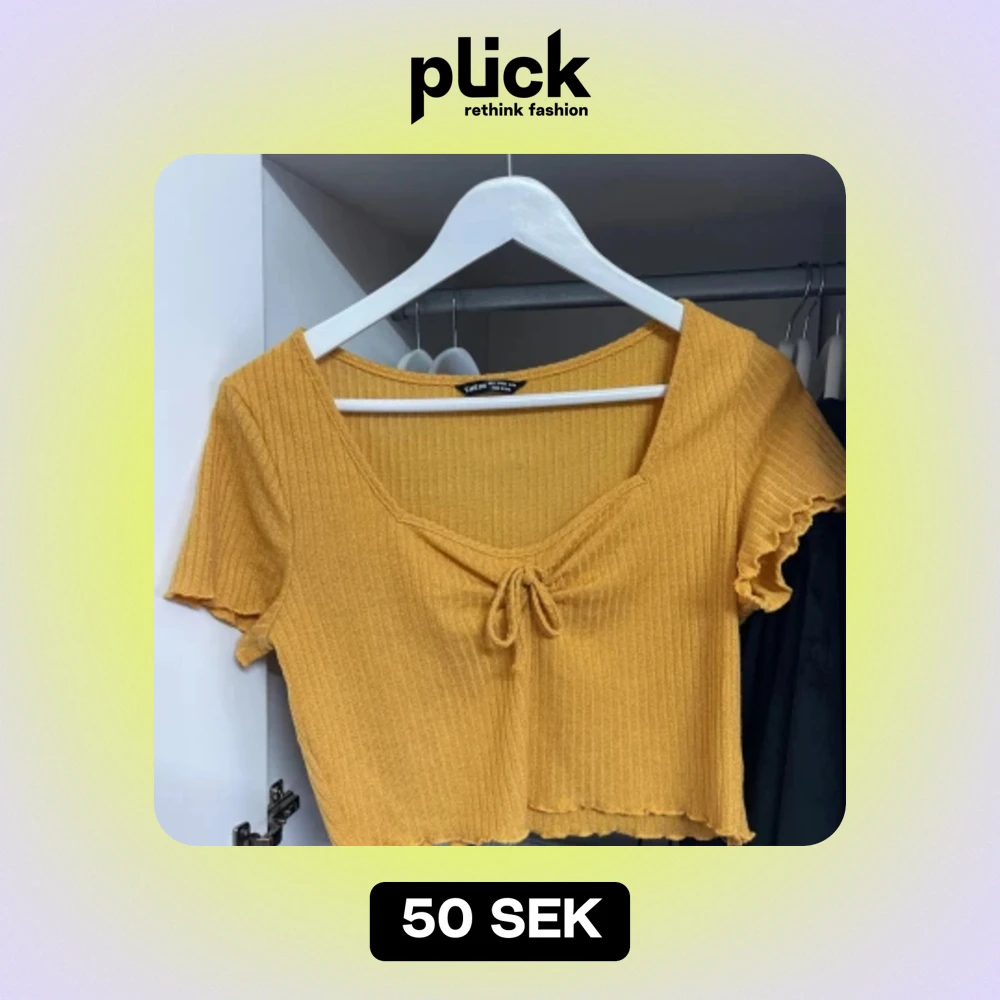 Säljer en superfin gul ribbad topp från Shein i storlek L, passar M. Den har korta ärmar med volangdetaljer, en söt knytning framtill. Perfekt för sommardagar eller en avslappnad vårlook. Toppen är croppad, ger en härlig färgklick till garderoben!