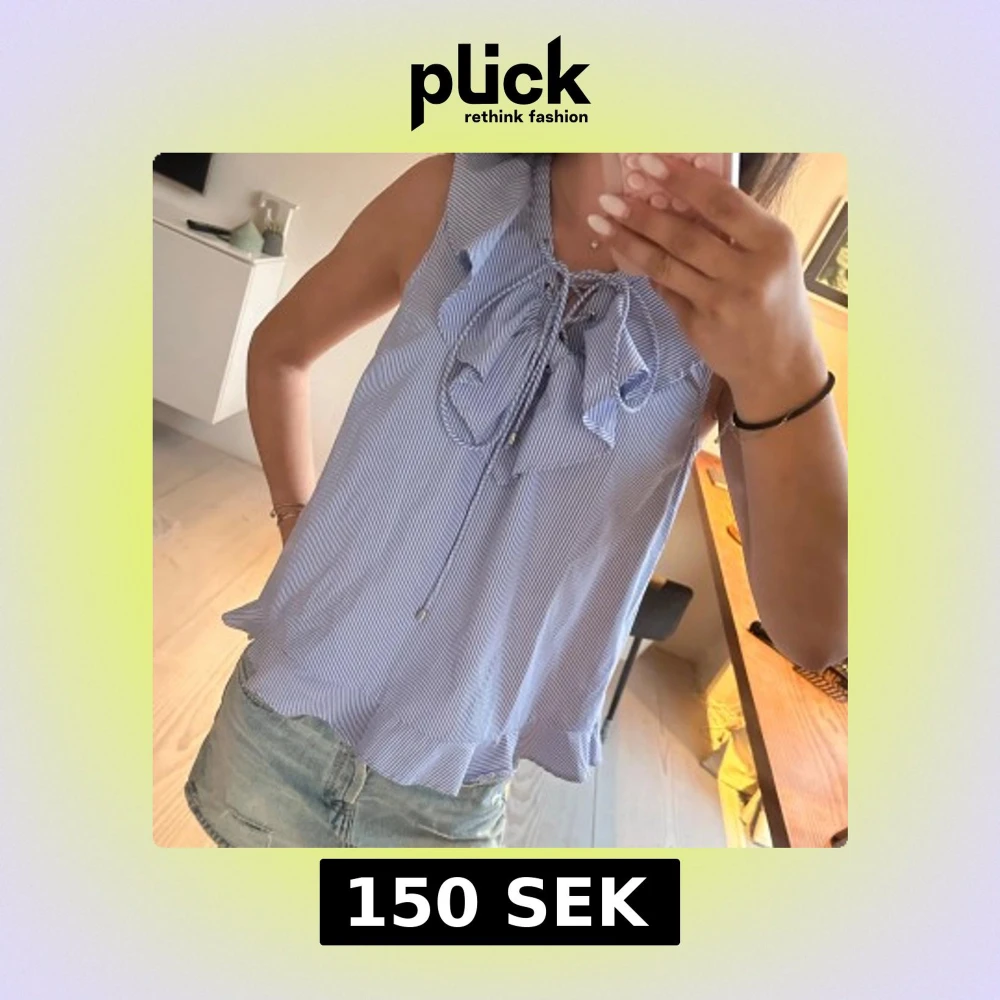 Säljer en söt blåvit randig blus med volangdetaljer och knyt framtill. Blusen är ärmlös och har en luftig passform, perfekt för varma dagar. Passar lika bra till jeansshorts som till kjol.