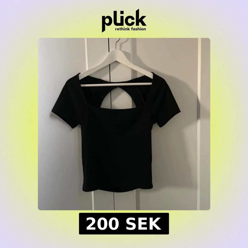 Säljer en svart topp med korta ärmar och en snygg öppen rygg med rund utskärning. Toppen har en rak, croppad passform och i ett skönt material som inte sitter åt!