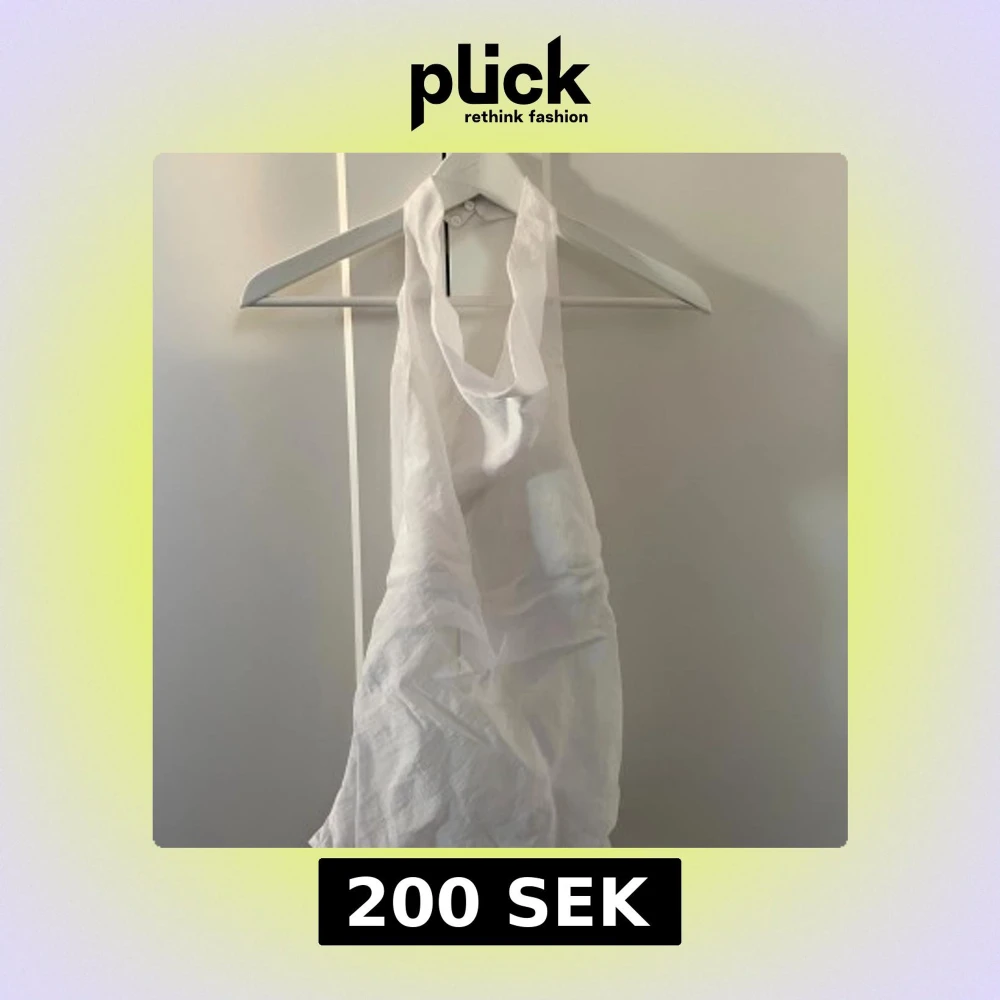 Säljer en vit omlott linnetopp med halterneck och öppen rygg. Toppen har en snygg draperad front och knäpps i nacken. Materialet är lätt och luftigt. Det finns ett snöre om det önskas att knyta den så den sitter tajtare i midjan, jag använde inte de och gömde det (syntes inget alls)