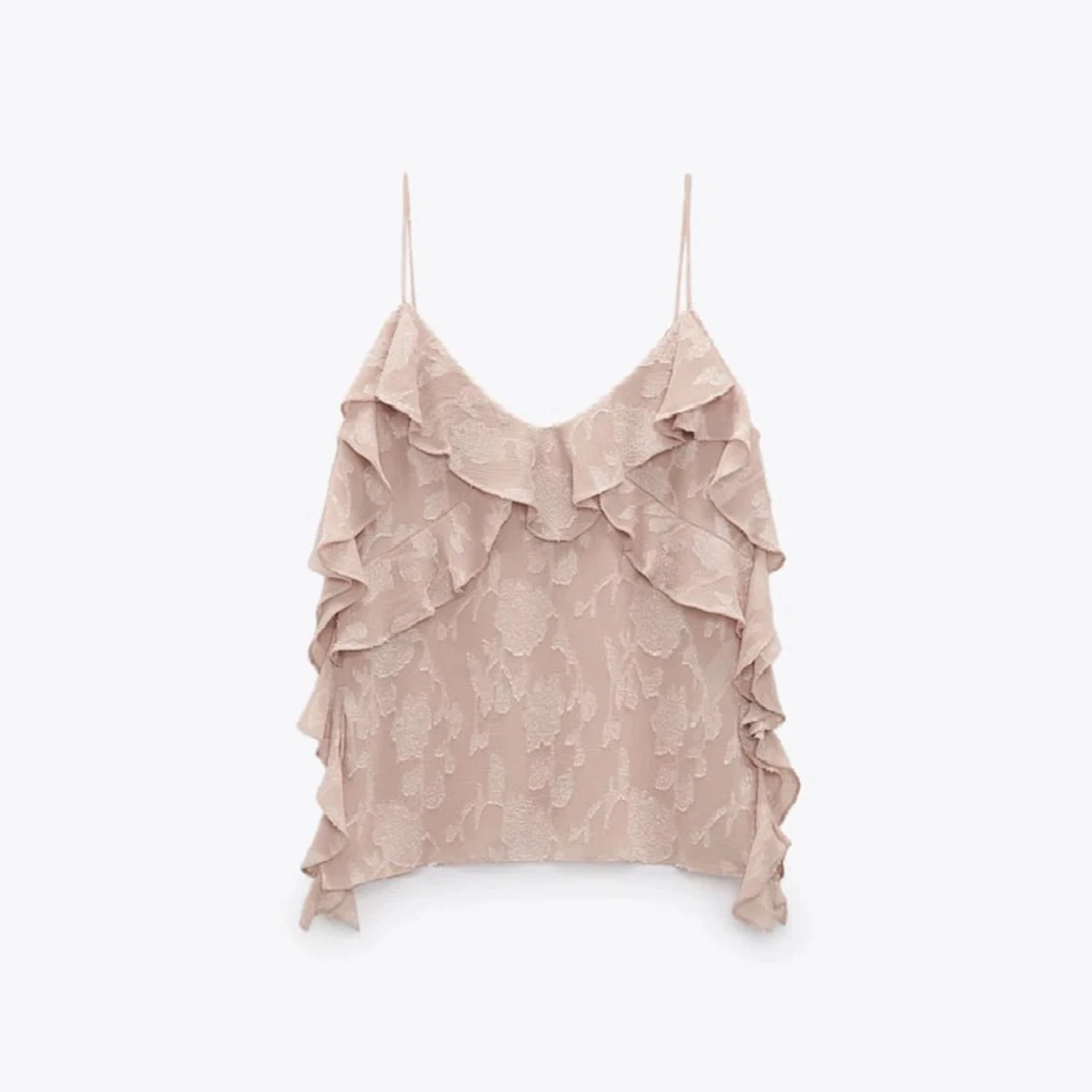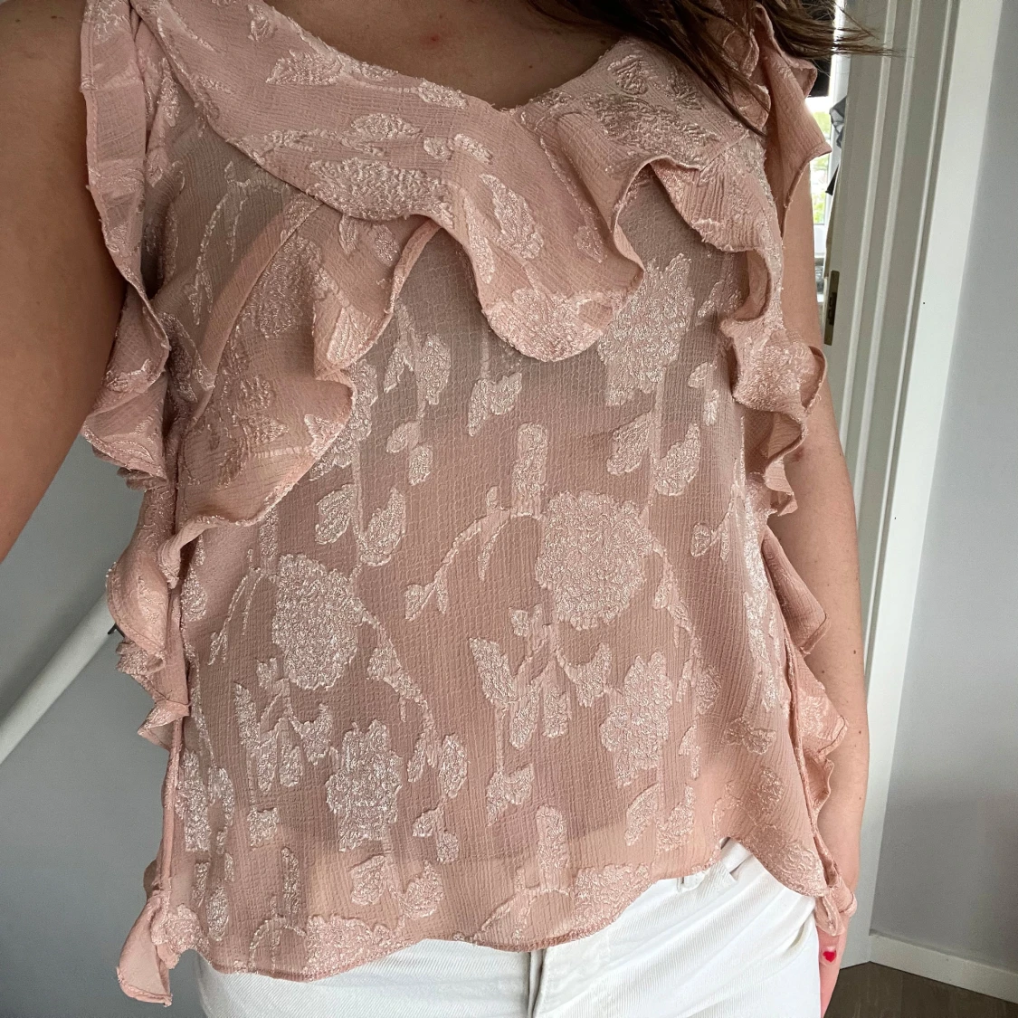 Supersöt rosa linnetopp med tunna axelband och volanger längs v-ringningen och sidorna. Tunt, lätt tyg med diskret blommigt mönster som ger en somrig vibe. Perfekt för varma dagar när du vill känna dig extra fin.