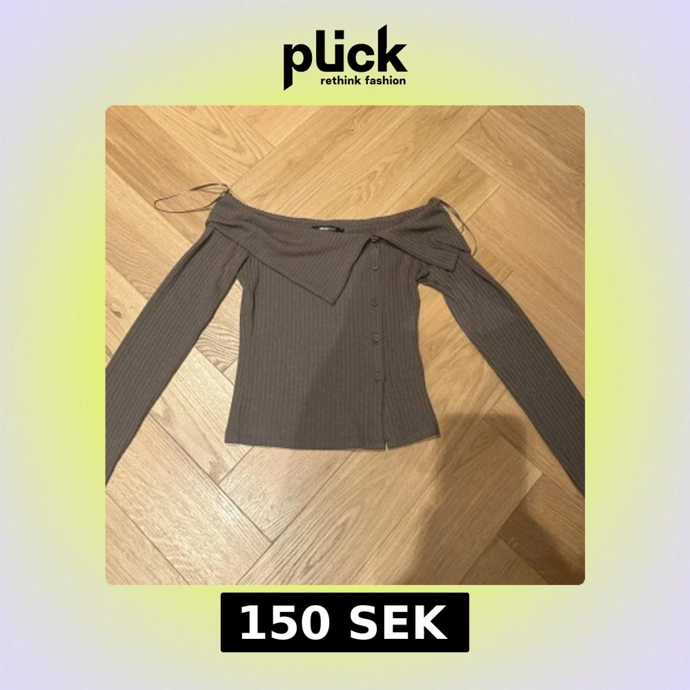 Säljer en brun ribbad offshoulder topp från Gina Tricot med långa ärmar och dekorativa knappar framtill. Toppen har en snygg asymmetrisk krage och smala axelband som ger en unik look. Perfekt för dig som gillar trendiga detaljer och stilren design.