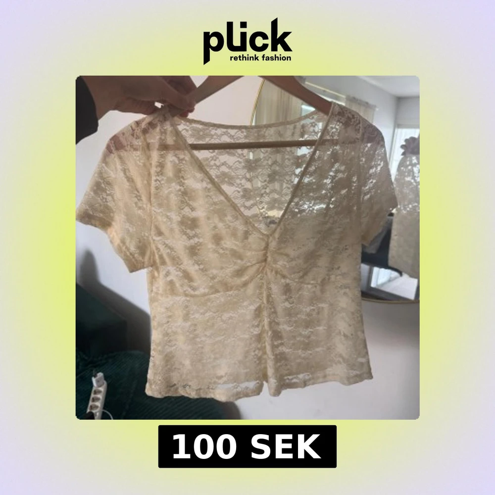 Säljer en superfin beige blus i spets med korta ärmar och v-ringad hals. Blusen har lätt rynk framtill och är genombruten med blommigt spetsmönster. Perfekt för dig som gillar romantisk och feminin stil.