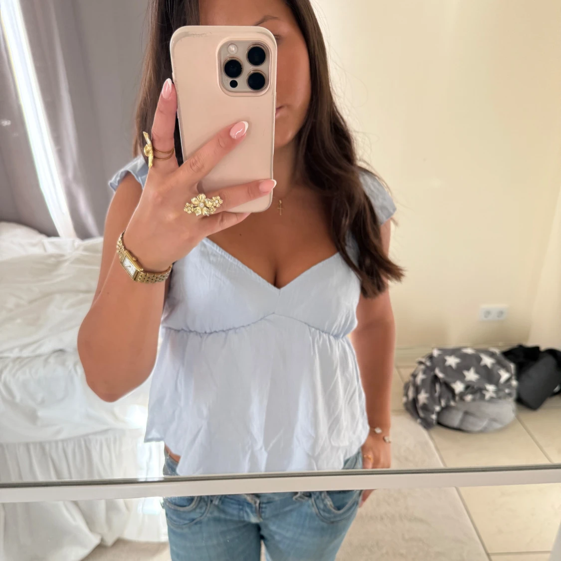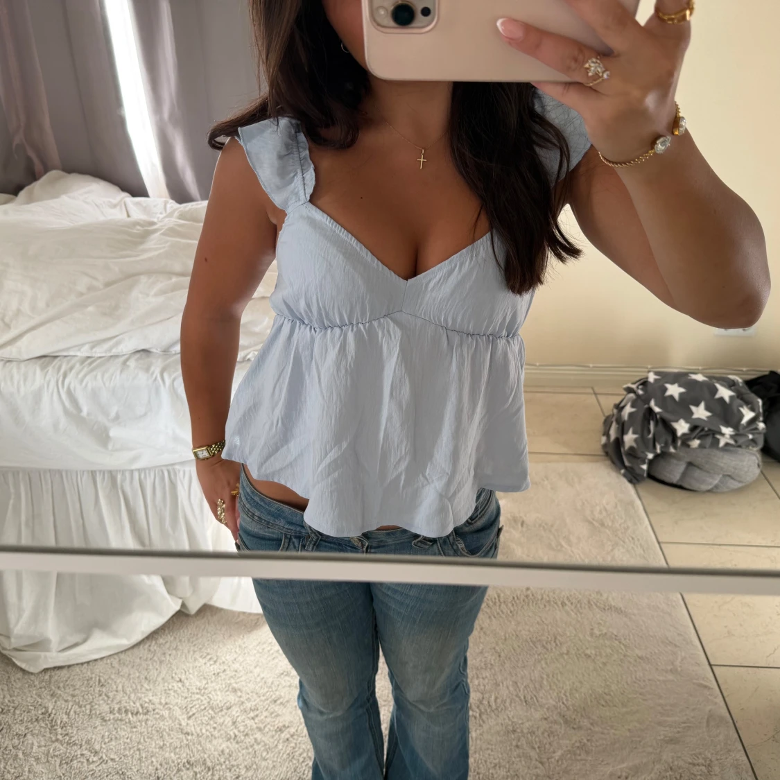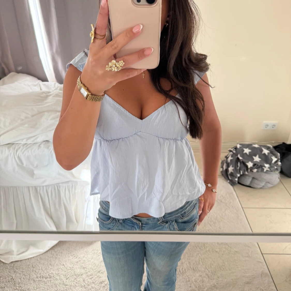 Ljusblå volang blus med v-ringning