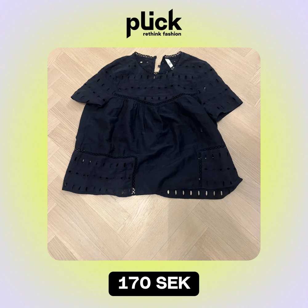 Säljer en svart blus med fina spetsdetaljer och korta ärmar. Blusen har en lös passform och dekorativa hålmönster som ger en elegant touch. På baksidan av blusen finns även knappar så man kan stänga💕