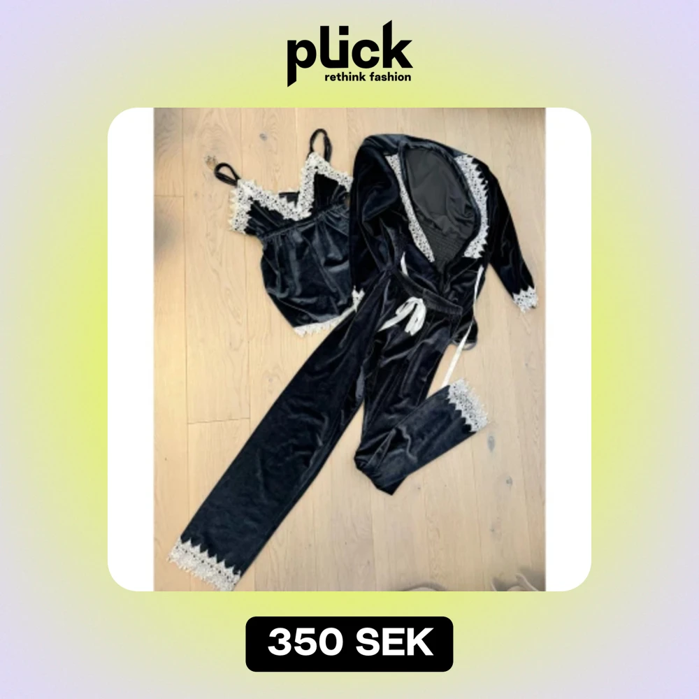 Mysig och elegant marinblå pyjamas-set i sammet med vackra vita spetsdetaljer. Setet inkluderar ett linne, matchande byxor och en morgonrock med knytband i midjan. Sparsamt använd. Perfekt för en lyxig hemmakväll!