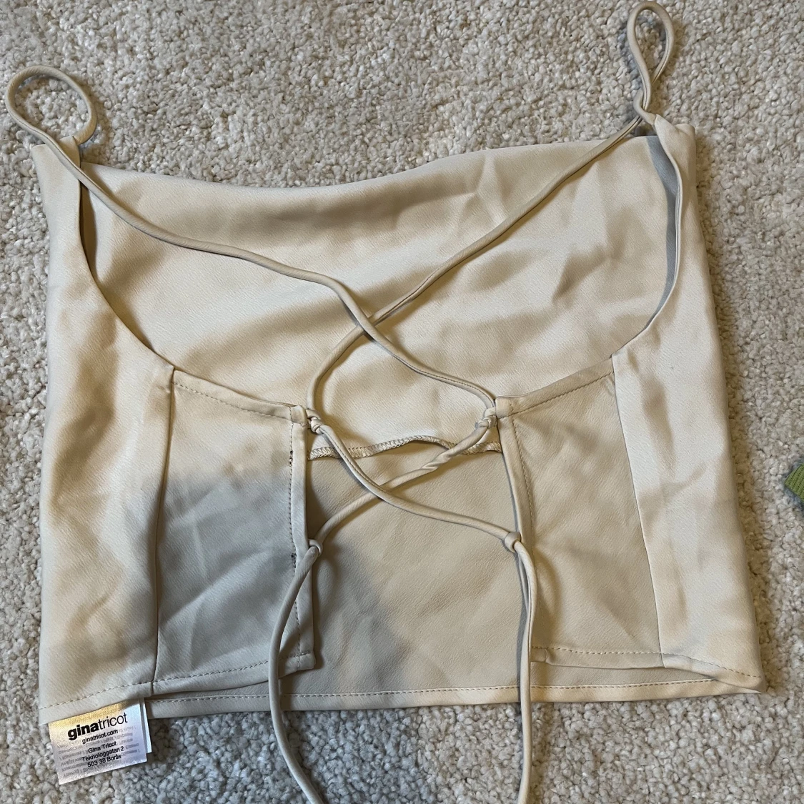 En super gullig och fin topp från Gina Tricot i satin. Faller snyggt över bröstet och knyts i kors/omlott i ryggen. En super fin champagne färg och i strl 34