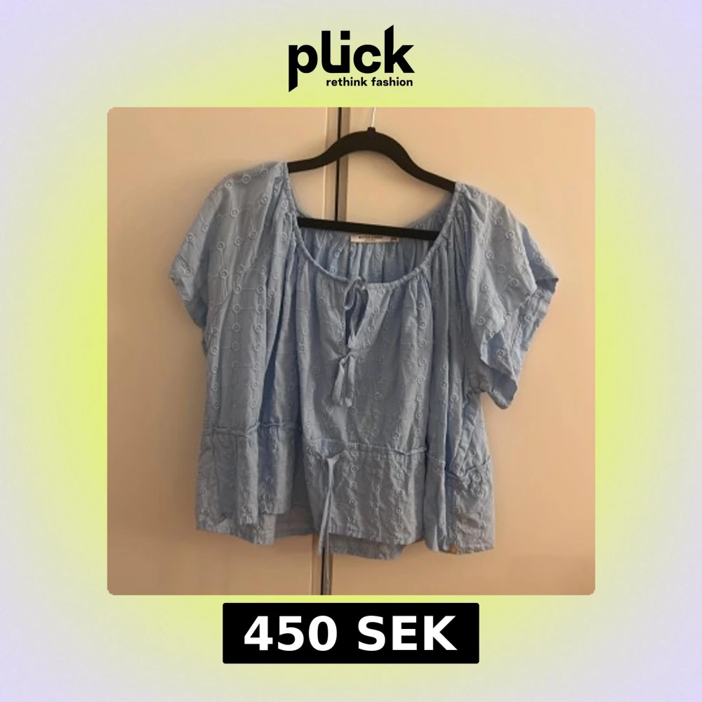 Supersöt ljusblå blus från Scotch & Soda med broderade cirklar, kort ärm och knytning vid halsen. Blusen har en luftig och flowy passform, perfekt för varma dagar. Snygg volangdetalj nedtill och lätt strukturerat tyg. Ny utan prislapp.