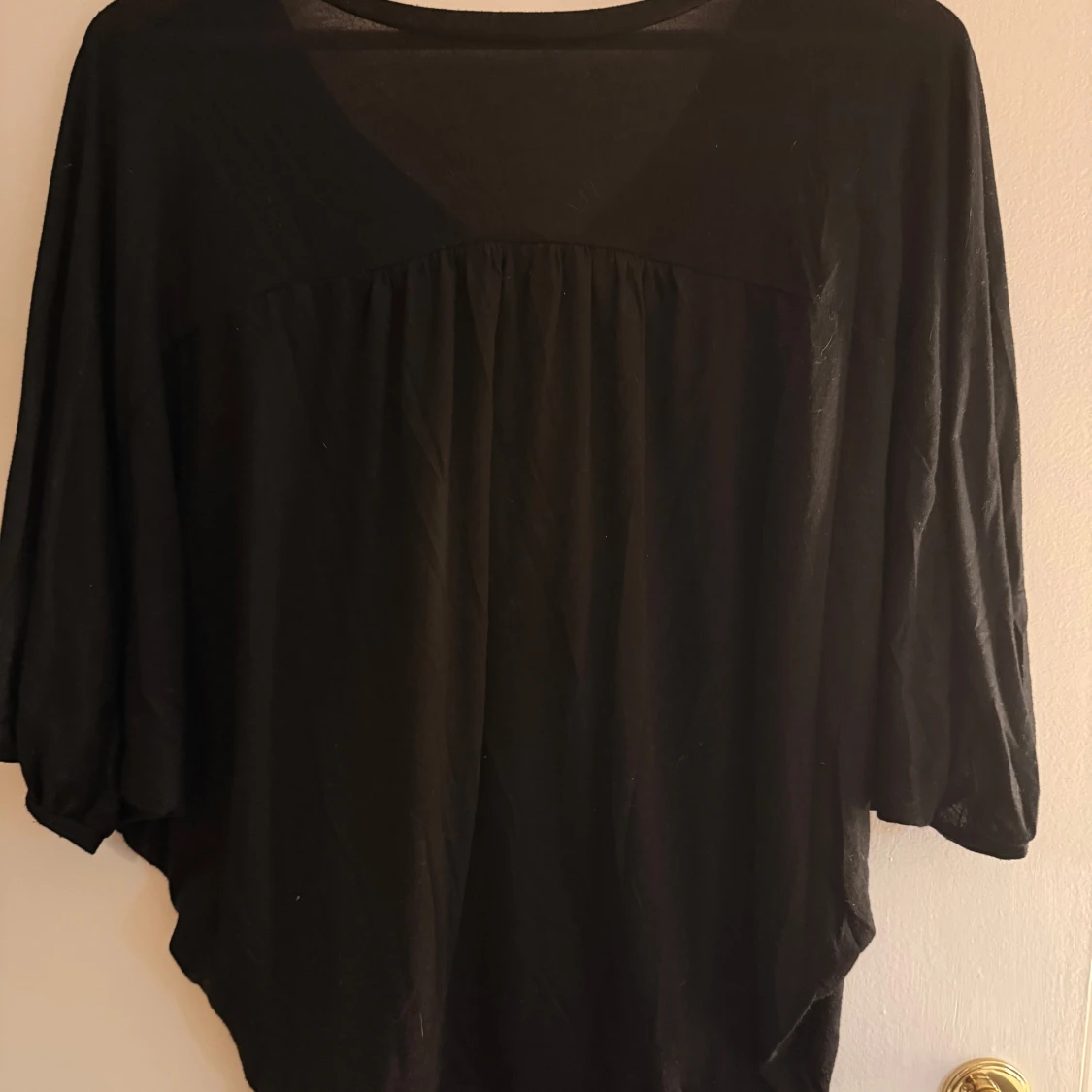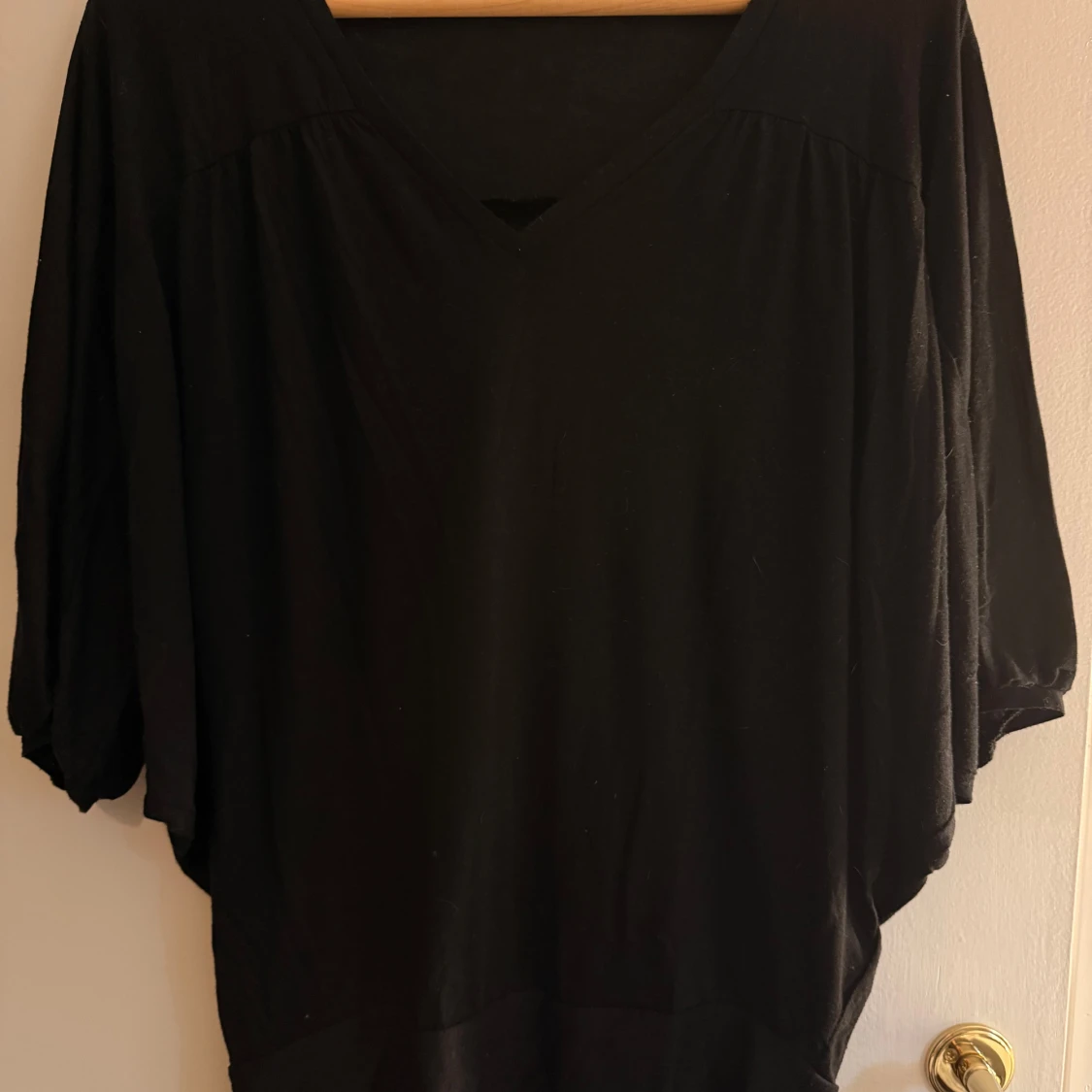 Svart v-ringad topp från Second Female i lös passform. Modellen har trekvartsärmar och är tillverkad i en mjuk blandning av viskos och polyester. Perfekt för dig som gillar en enkel men stilren look.