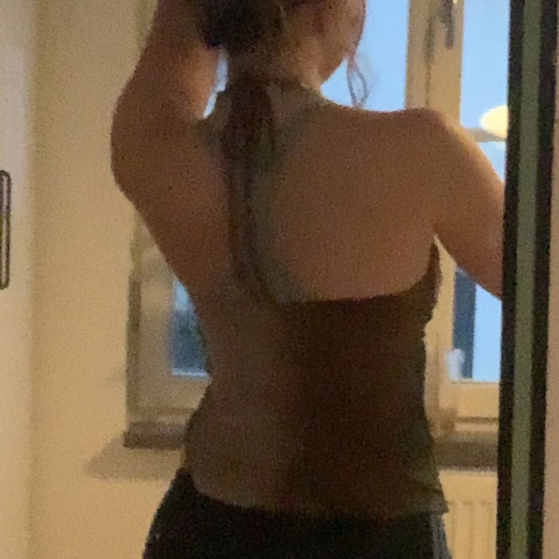Den här toppen har en ring i mitten där fram, luftigt material, man kan knyta där bak o är öppen där bak❤️