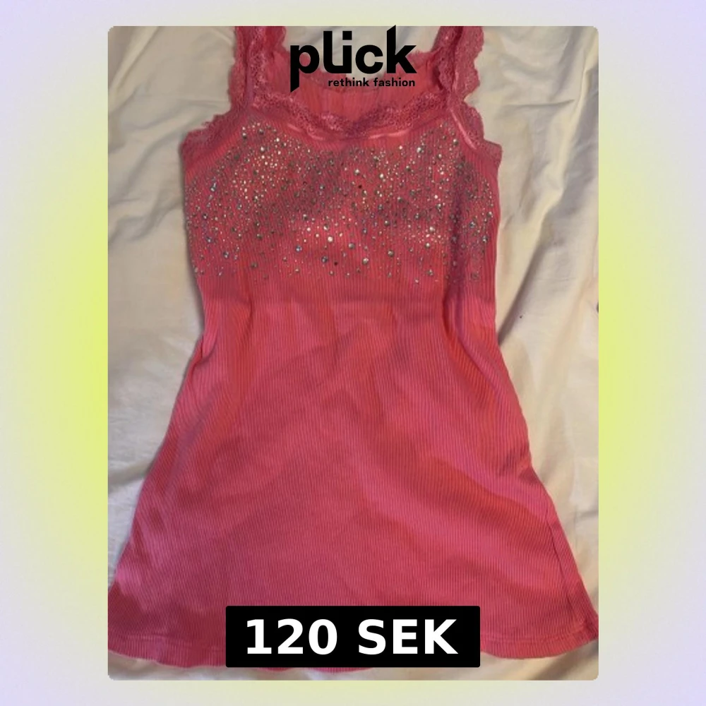 Supersöt rosa linnetopp med ribbad struktur, spetsdetaljer vid axelbanden och massor av glittrande. Den är thriftad på vintage marknad utomlands!