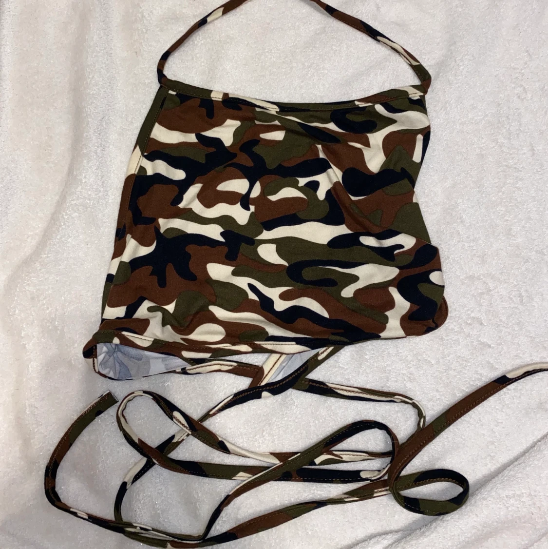 Säljer denna toppen då den aldrig kommit till användning. Man knyter både uppe och vid ryggen, och kan även gå runt några varv vid ryggen vilket år jättesnyggt! Skickar fler bilder om det önskas ✨ köparen står för frakten❣️