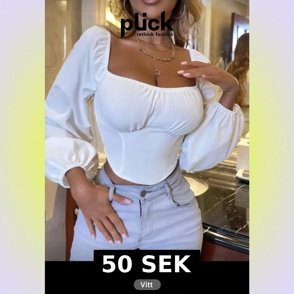 Supersnygg vit korsettopp med fyrkantig ringning och puffiga långärmar. Toppen är croppad och har smockad rygg för extra komfort. Materialet ser ut att vara satin eller polyester med lätt glans. Perfekt för dig som vill ha en trendig och feminin look.