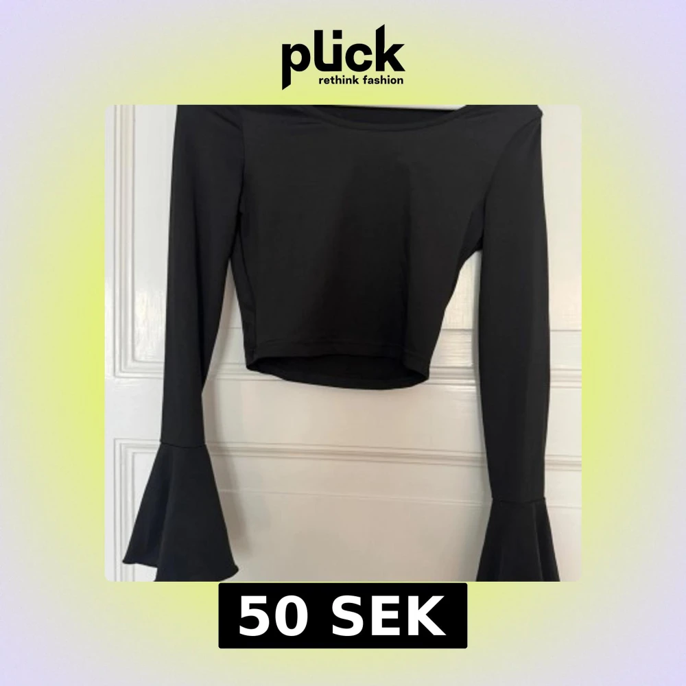 Svart croppad topp från SHEIN med långa trumpetärmar som ger en snygg statement-look. Toppens material är mjukt och stretchigt, perfekt för att skapa en cool outfit. Enkel rund halsringning och figurnära passform.