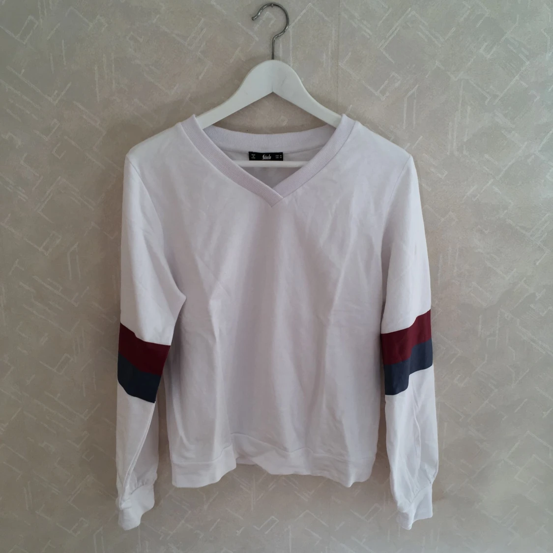 Oanvänd fin tröja med tryck på ärmarna. Passar en XS/S.