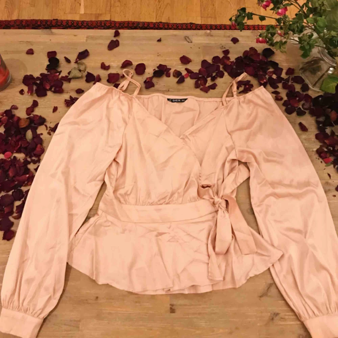 en superfin oanvänd rosa wrap topp i slätt mönster, i peplum modell och biskopsärmar. säljer pga har en annan topp ungefär liknande denna och den här kommer inte till användning. originalpris 209kr