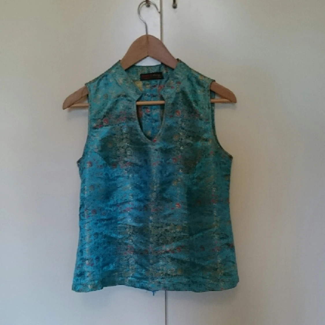 turkos sidentop med guldmönster. passar från strl 34 för lösare passform o för tightare upp till strl 40