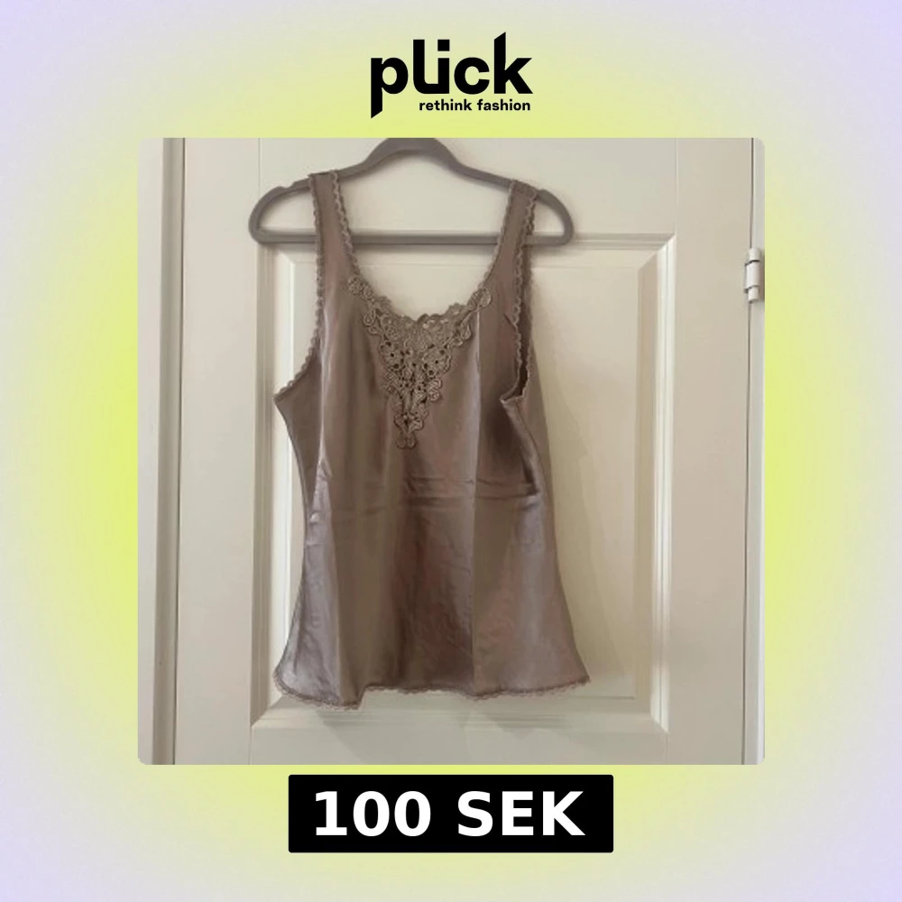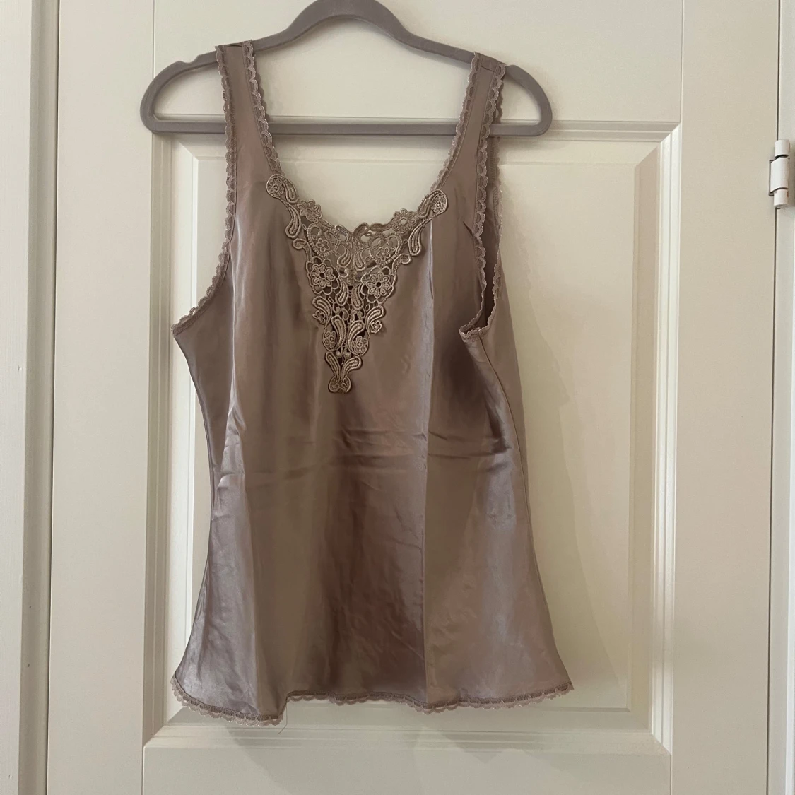 Supersnyggt mörkbeige linne i siden med vacker spets och broderade blommor framtill. Pris kan disskuterasđ€âš