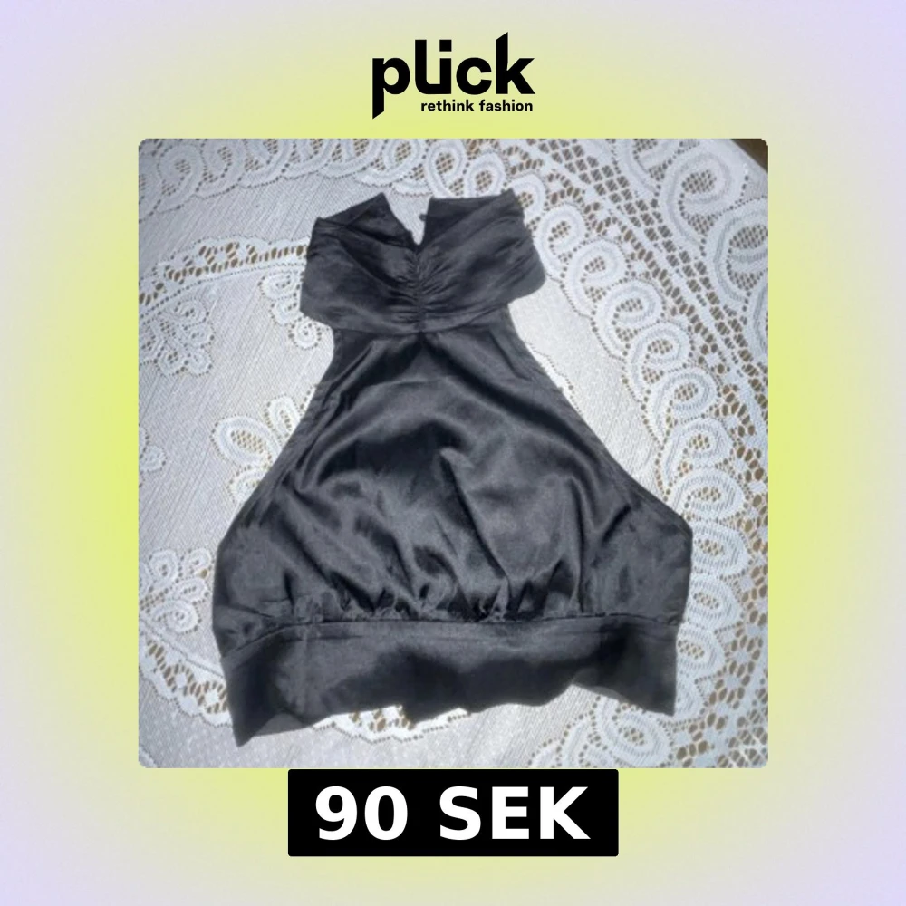 Elegant svart axelbandslös topp med knytning i ryggen. Tillverkad i ett glansigt material som ger en lyxig känsla. Perfekt för en kväll ute. Nyskick