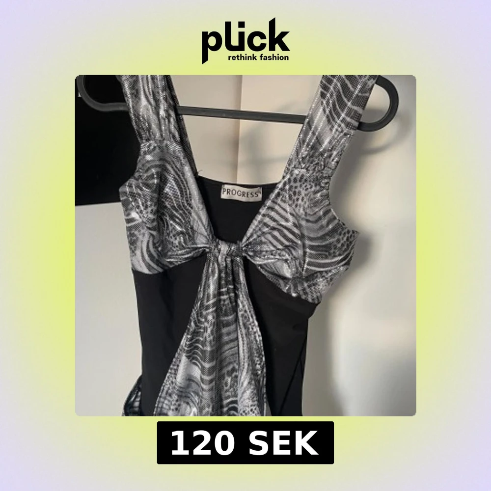 Snygg svart topp med silvermönstrade detaljer från Progress. toppen har ett unikt mönster och en knytning framtill som ger en elegant touch. Perfekt för en kväll ute eller en speciell tillställning. tyvärr inte mycket utrymme för större bröst :(💕