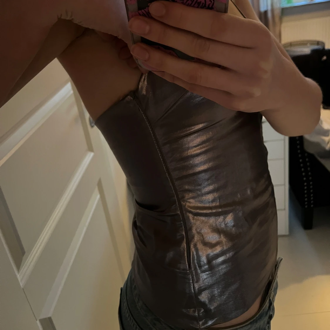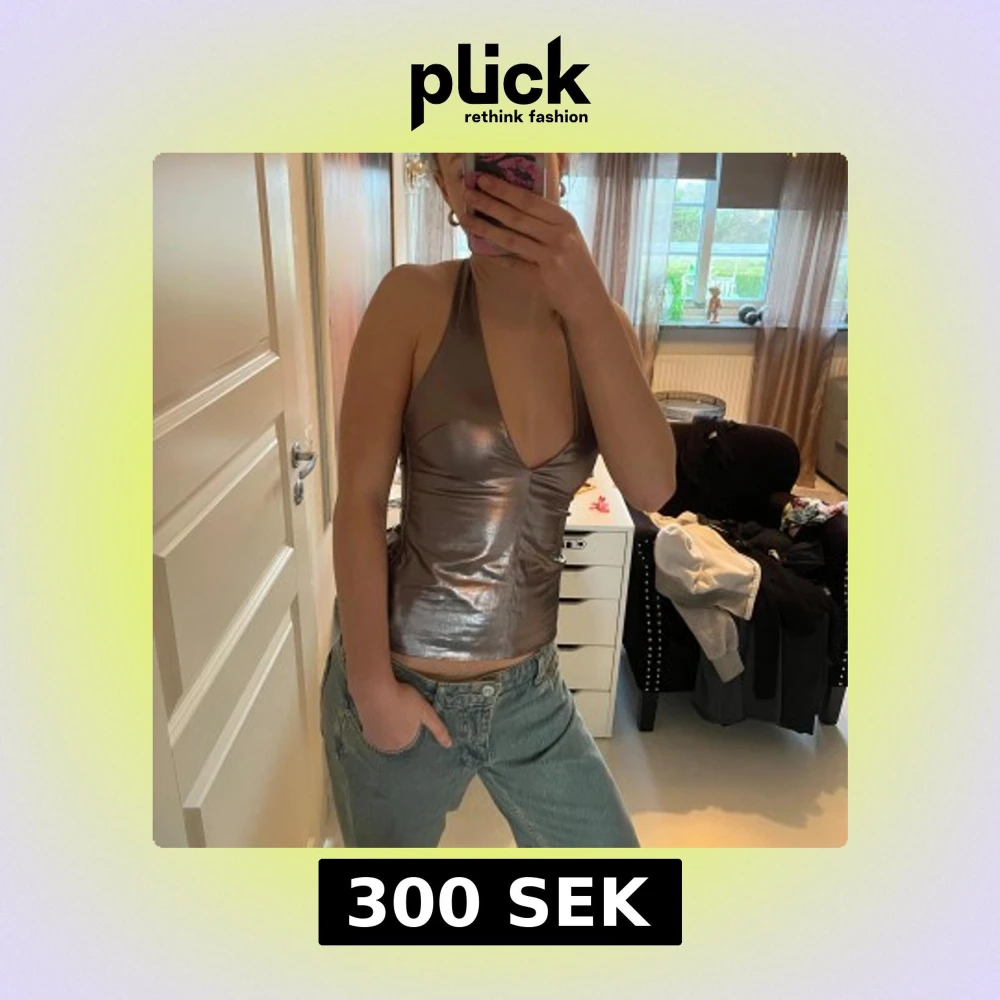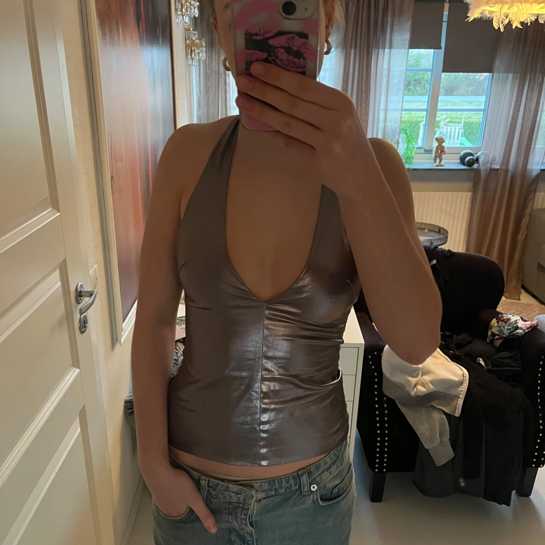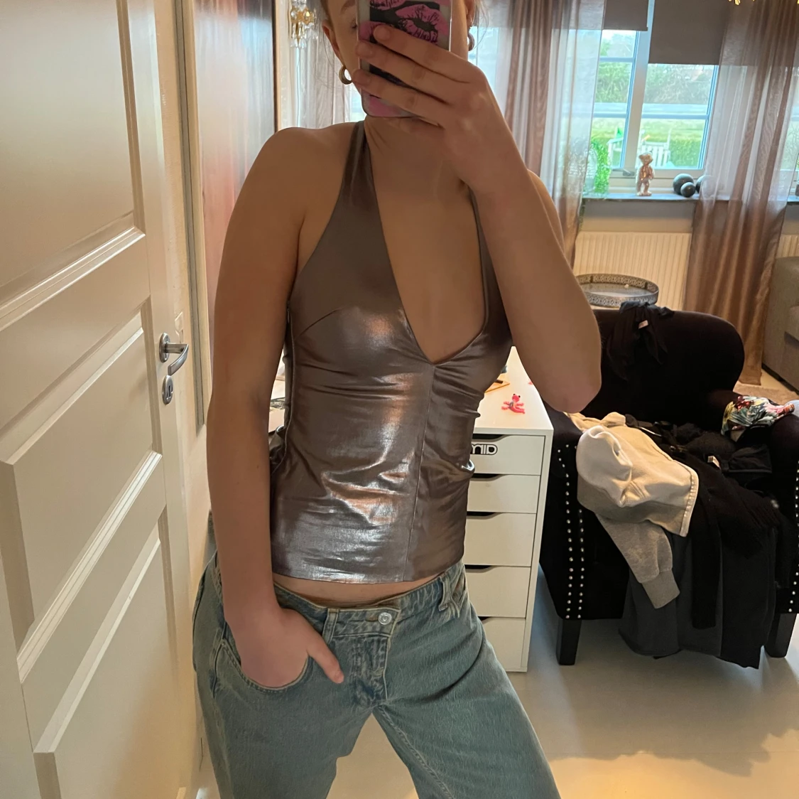 Snygg och glansig silverfärgad halterneck topp med djup v-ringning. Den har en dragkedja på sidan. Använt två gånger, så den är i nyskick💞💞💞