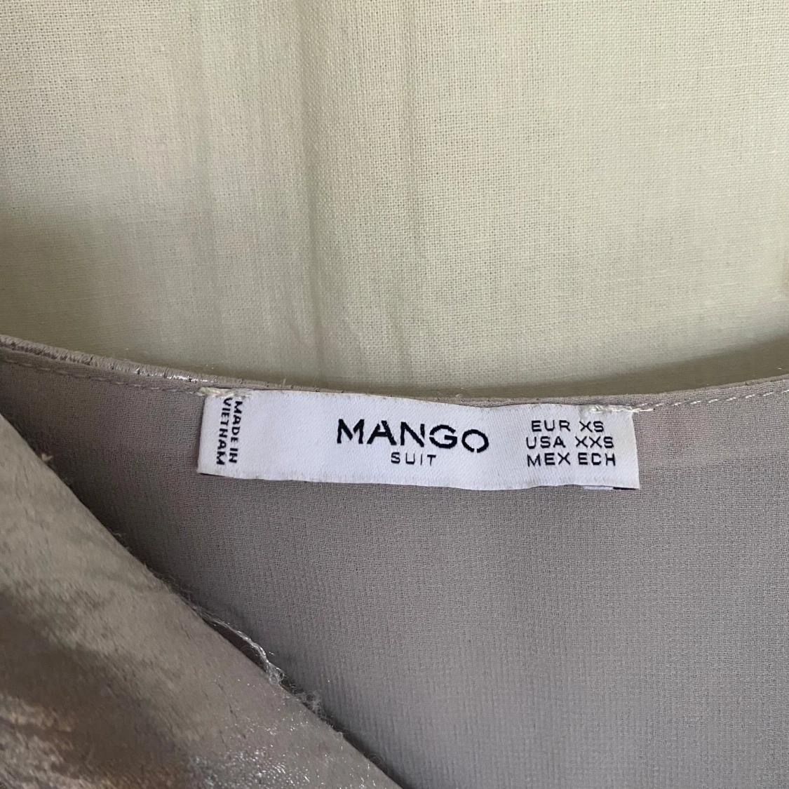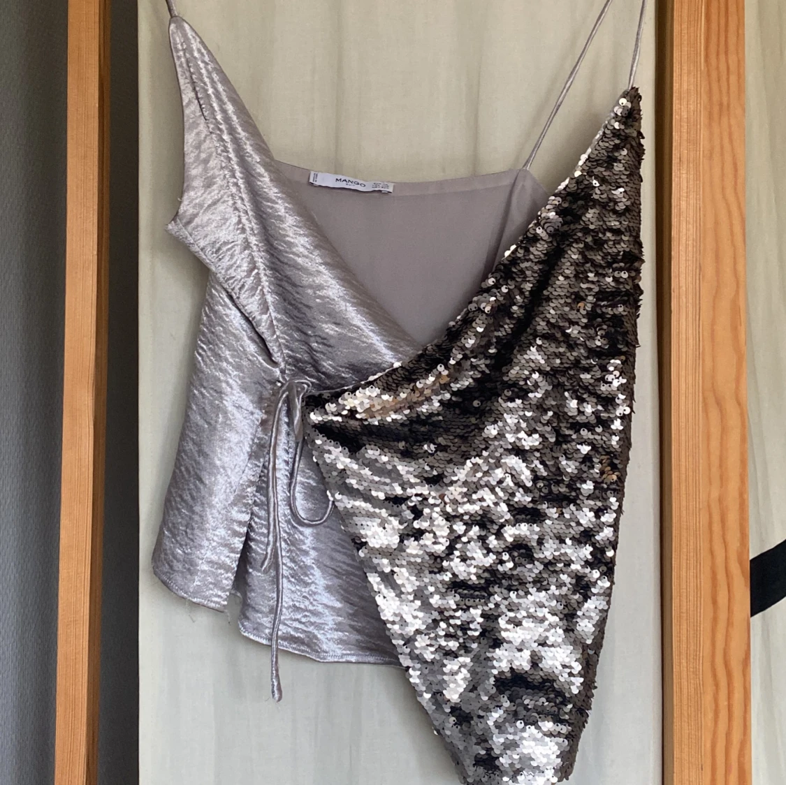 Supersnygg asymmetrisk topp från Mango i silver. Tunn axelbandsmodell med omlott och knyt i sidan. Perfekt festtopp! Är xs men passar snarare som S, även väldigt justerbar då man knyter den.