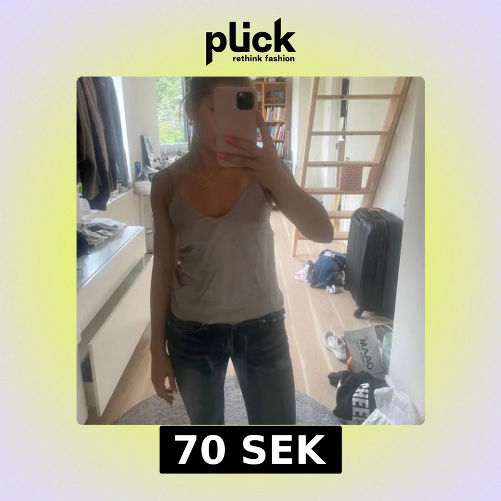 Säljer en silvrig linnetopp från H&M i glansigt satinliknande material. Toppen har smala axelband och v-ringning, perfekt för att ge en stilren och trendig look. Passformen är normal och toppen är ärmlös.