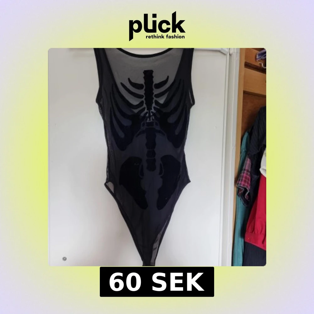 En svart body med ett skelett på. Slelettet är i sammetimiterande tyg, resten är genomskinlig. Stretchig.
