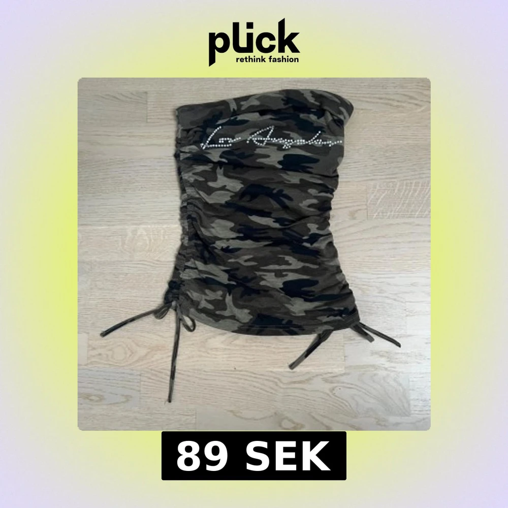 Säljer en camouflagemönstrad tubtopp med snörning i sidorna och strassdetaljer framtill som bildar texten 'Los Angeles'.