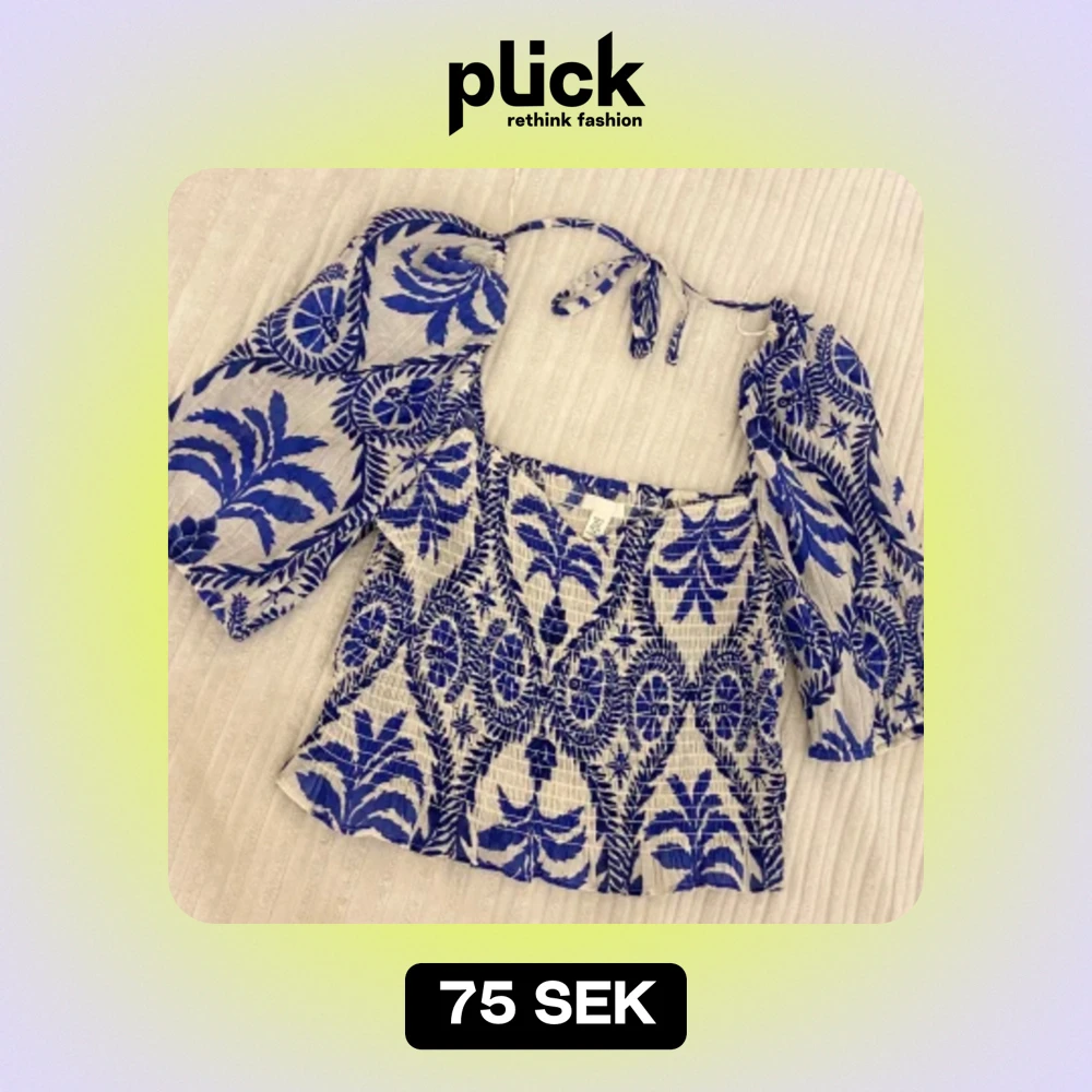 Somrig blus med puffärmar som inte kommit till användning. Vit med blått palm/blommönster. Knytband på rygg/nacke. Endast använd nån enstaka gång, är som ny ✨