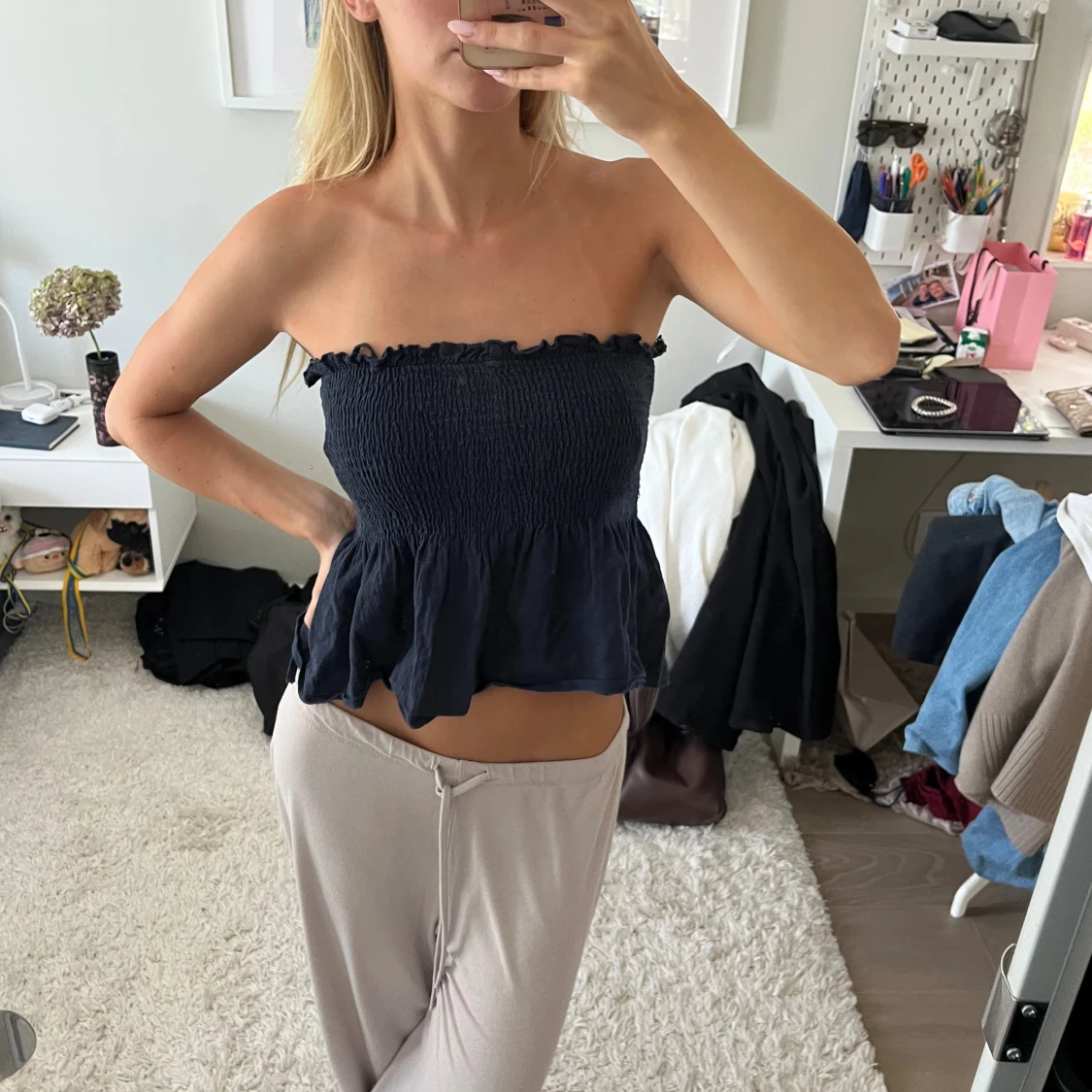 Supersöt mörkblå topp med smockad överdel och volang nertill. Axelbanden kan knytas eller tas bort för axelbandslös look. Perfekt för varma dagar och ger en chill vibe. Tunt, mjukt tyg som känns skönt mot huden.
