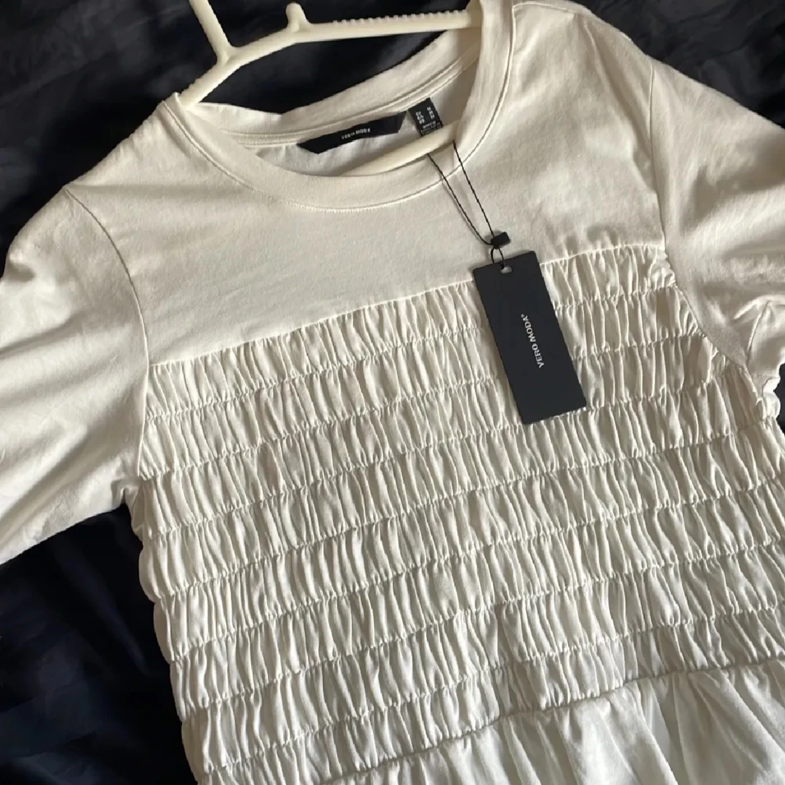 Säljer en söt vit smock topp från vero Moda med korta ärmar och smockdetaljer på framsidan. Toppen har en lätt volang nedtill som ger en fin siluett. Perfekt för en stilren look. Köpt för 379kr på Zalando. Aldrig använd! Storlek M